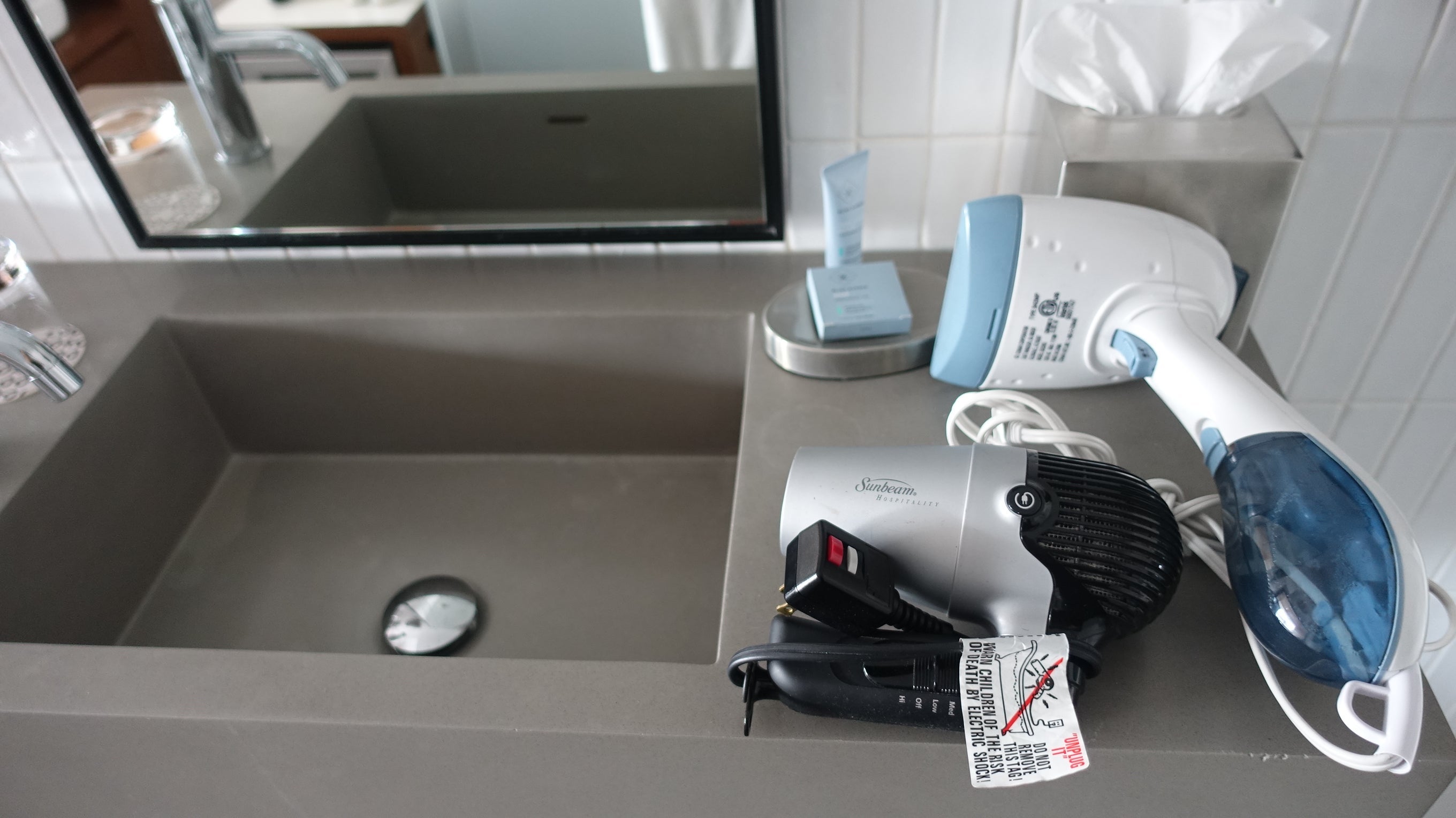 A hair dryer and steamer hung in bags next to the sink.