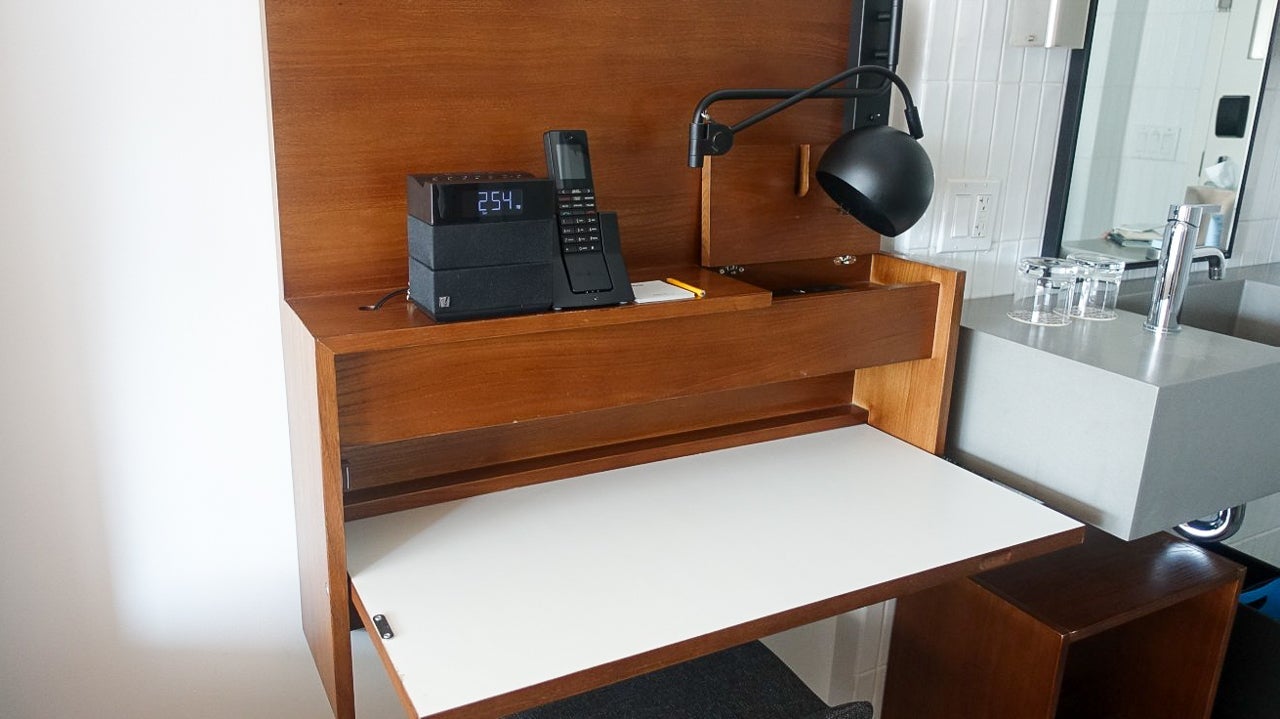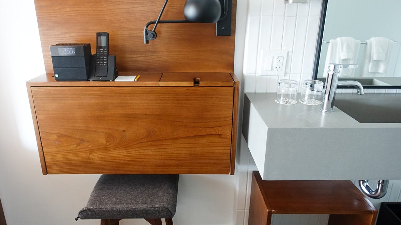 The desk, next to the sink, could be pulled down and folded up to save space. The "chair" was more of a stool, and the combination of the two wasn't really suitable for more than a few minutes of casual work. Any serious work you'd need to get done could easily happen in the abundant working space in the lobby.