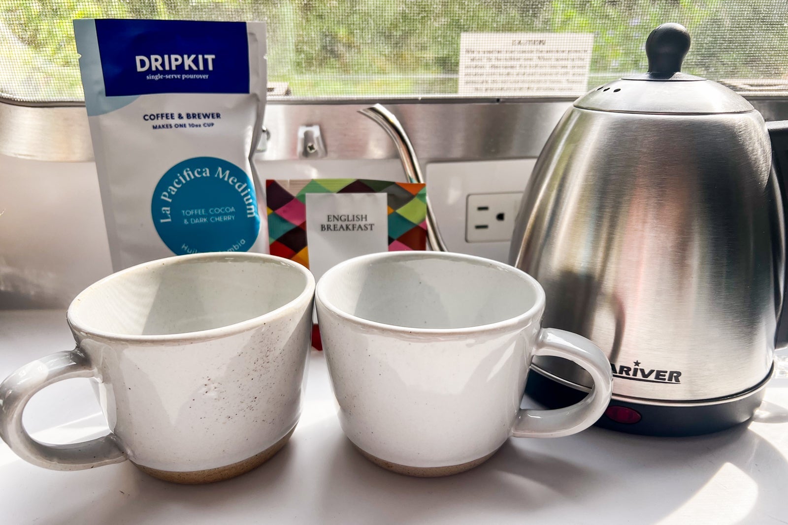 Should you wish to cook outdoors, you'll find a cast-iron pan to use over your personal outdoor fire pit, along with essentials like oven mitts and tongs. The only thing you need to bring is food, oils and spices (all of which can be purchased at the general store) since the kitchenette comes stocked with a full set of dishes, bowls, mugs and glasses. There's also Dripkit coffee to prepare with a provided electric kettle when you need a pick-me-up in addition to an outdoor table for alfresco dining.