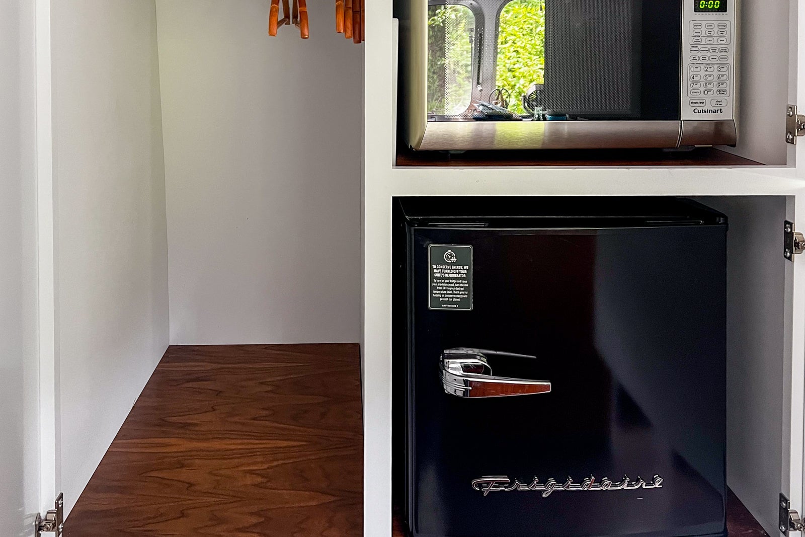 The living room shares a space with a small but smartly designed closet large enough to hide away luggage, as well as a kitchenette that blends efficiency and style. Hidden within the kitchenette's cabinets are a microwave and a minifridge large enough for storing about a week's worth of meals, plus a few drinks.