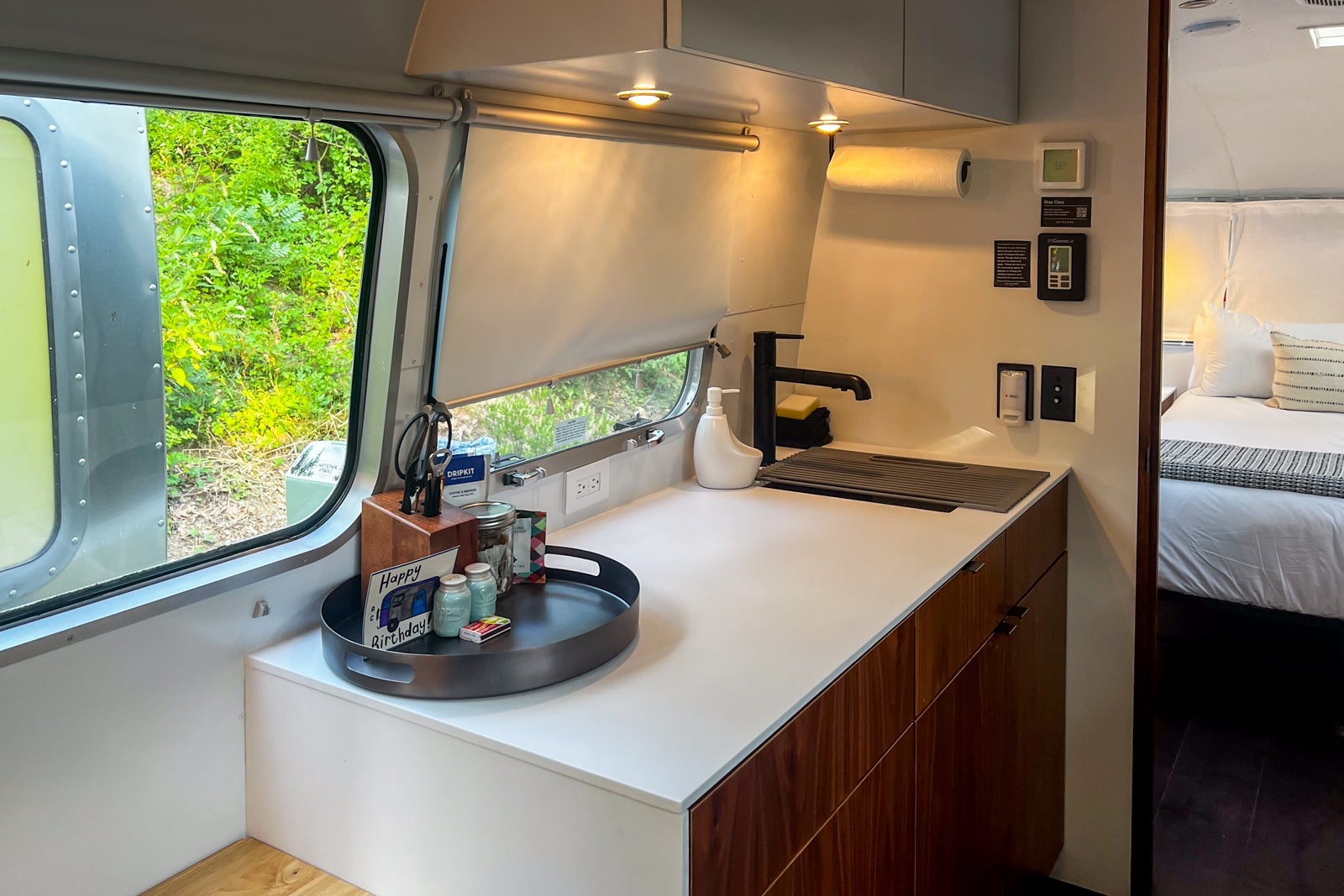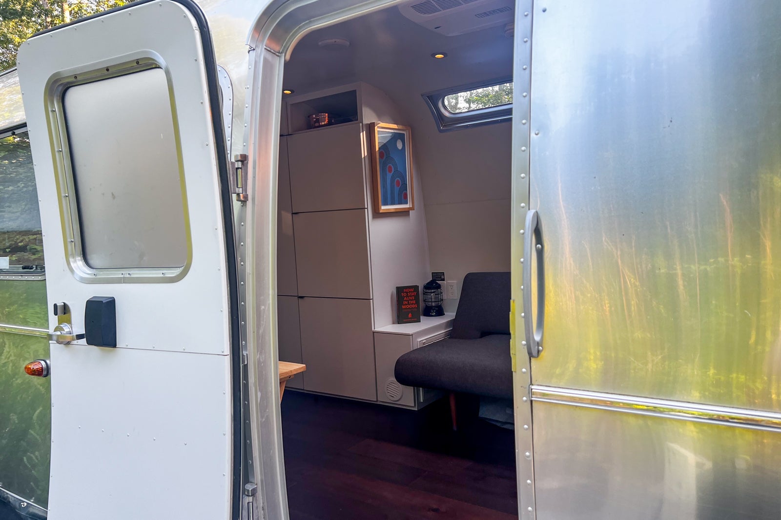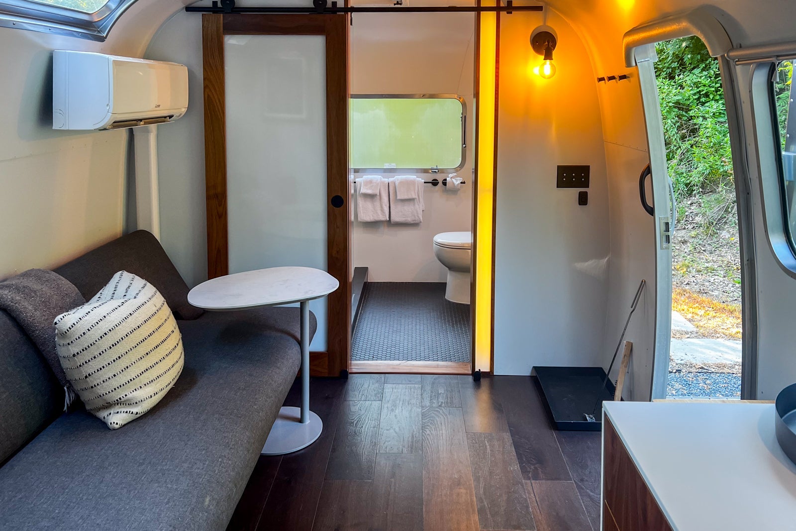 Entering our Airstream felt like being tagged in an Instagram influencer's feed. You're greeted by a well-designed, bright living space that is both functional and fashionable, with a futon that opens to comfortably sleep two, Bluetooth speakers for entertainment, a foldable TV tray-style table and a marble side table.