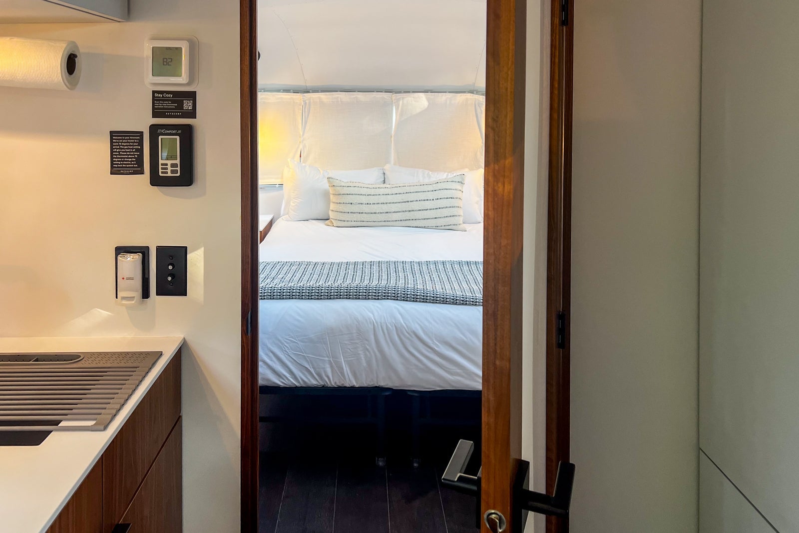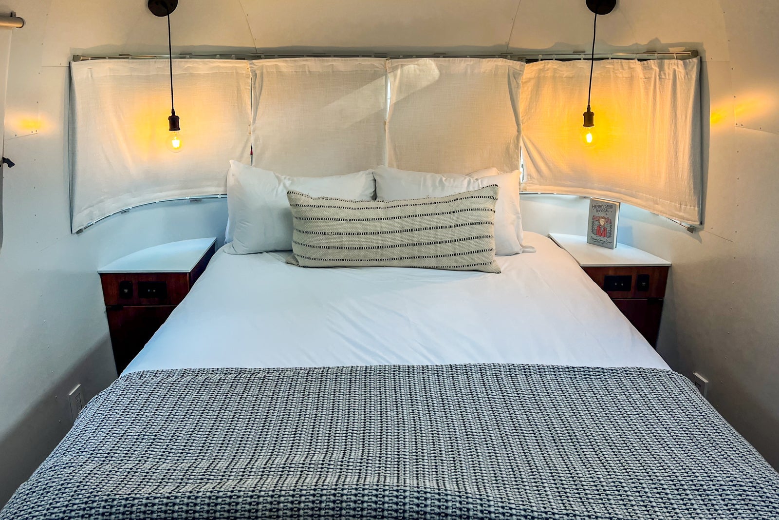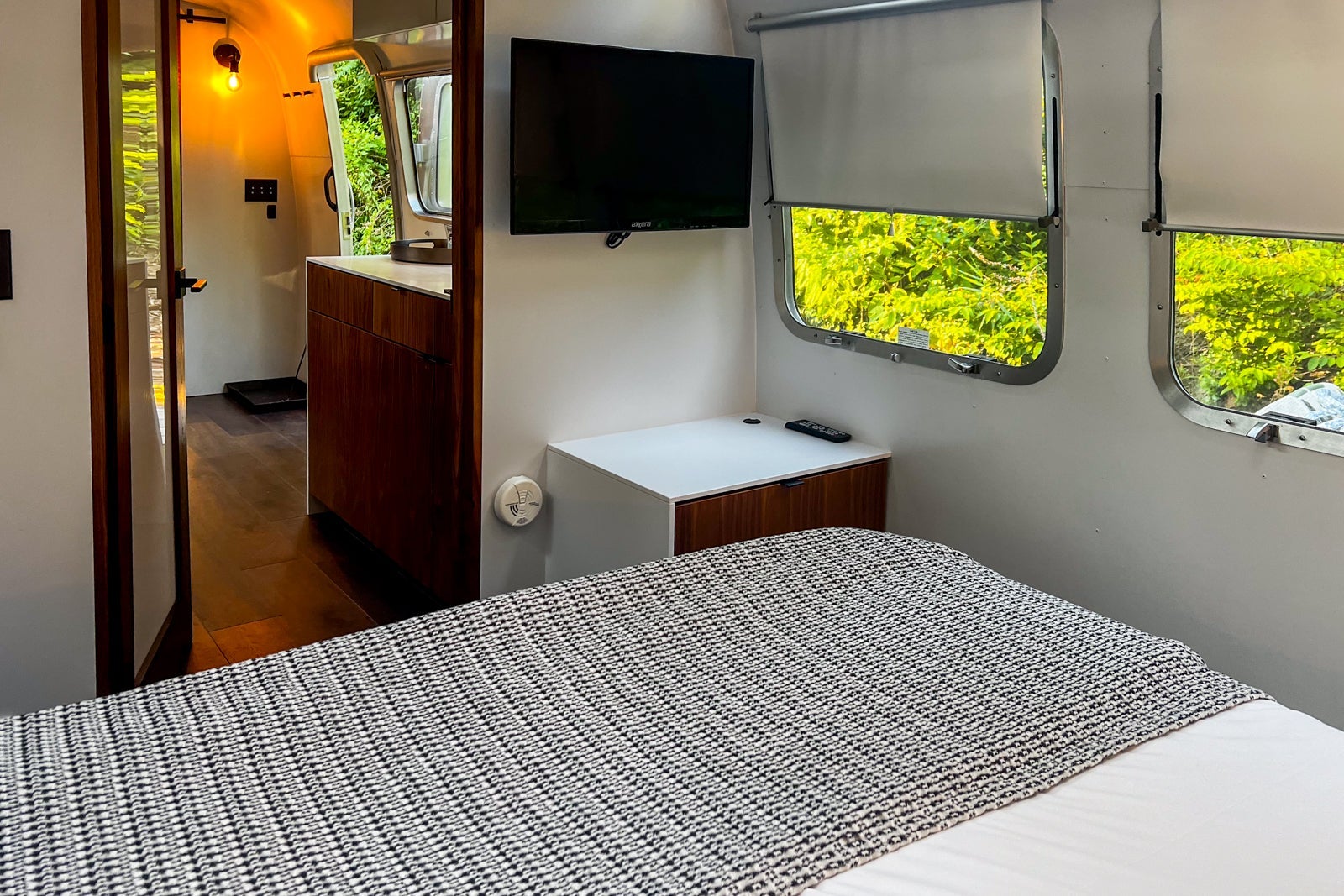 Entering our Airstream felt like being tagged in an Instagram influencer's feed. You're greeted by a well-designed, bright living space that is both functional and fashionable, with a futon that opens to comfortably sleep two, Bluetooth speakers for entertainment, a foldable TV tray-style table and a marble side table.