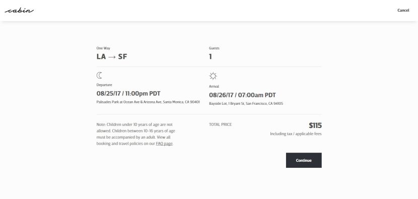 The only way to book your bus ride is through Cabin's website, which is simple and straightforward. Even on a mobile device, I was able to search for availability and book quickly with my credit card. Since I was traveling for business, I charged the $115 fare to my Ink Business Preferred Credit Card, earning 3x points — or in this case, 345 Ultimate Rewards points — for the travel purchase. The pricing is simple too: All routes are $115 each way. And while that may seem like a lot for a bus ride, as you'll see, this isn't just a seat on a Megabus. The fare is all-inclusive, even with taxes and two checked bags.