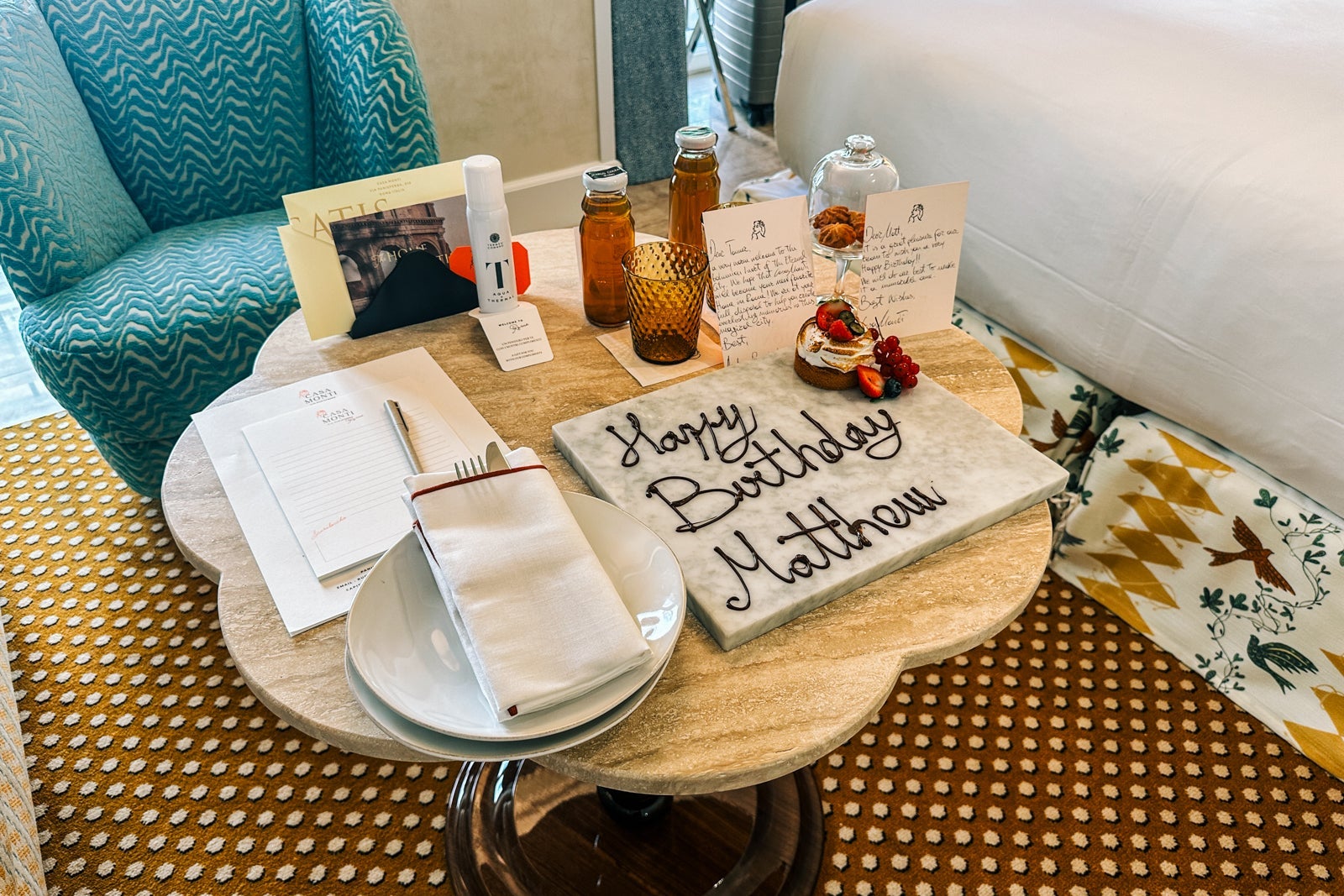 I had let the hotel know ahead of time that the day of our arrival was my husband's birthday, and they pulled out all the stops and had this beautiful chocolate birthday message and dessert waiting in the room.