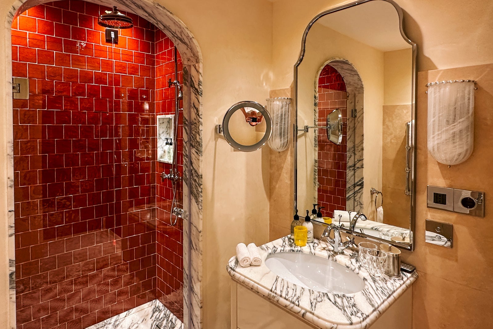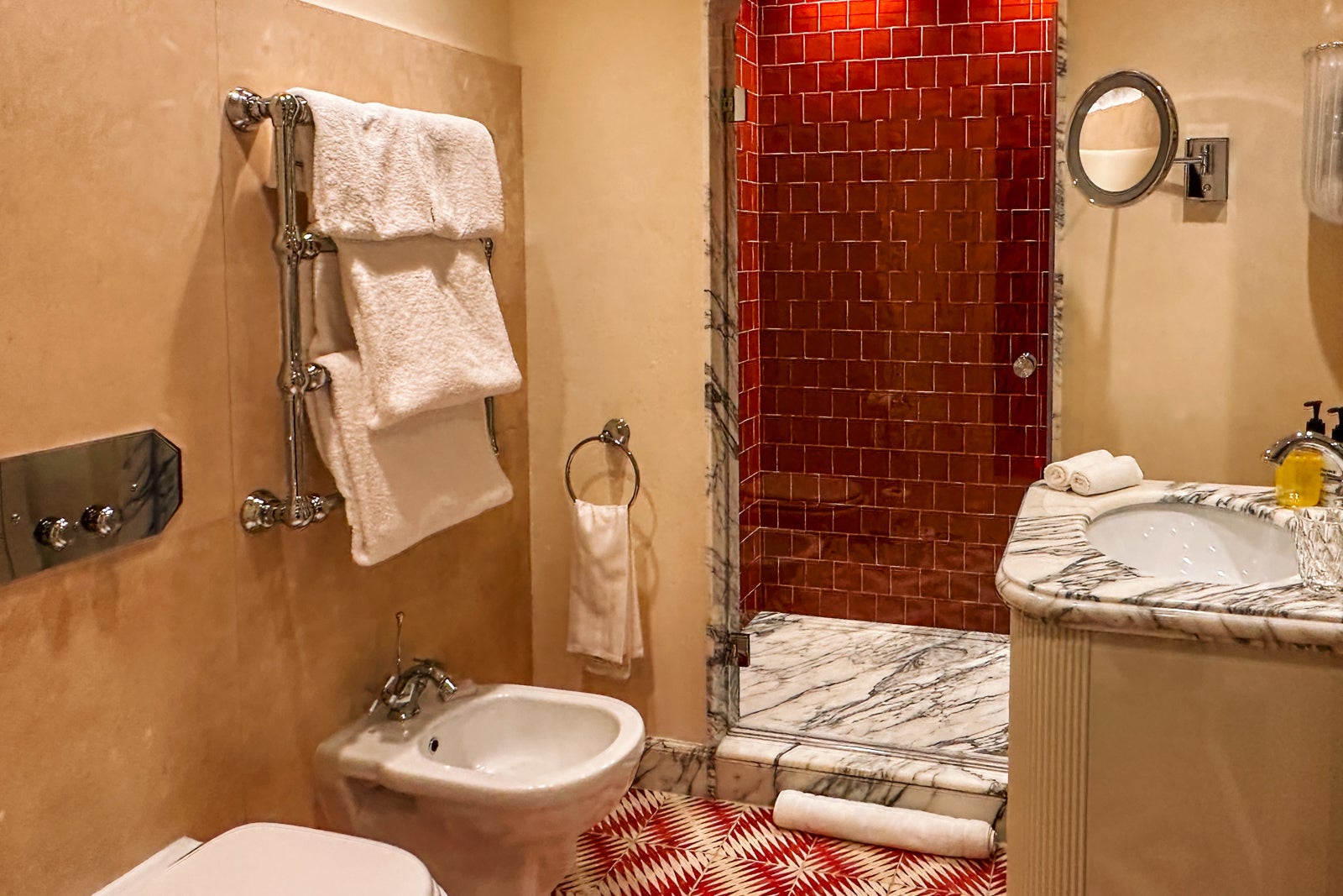 In the bathroom, deep-red tile work contrasted with neutral earthy tones and beautiful marble in the shower and on the vanity. The room also consisted of the toilet, a bidet and a towel rack with fluffy towels.
