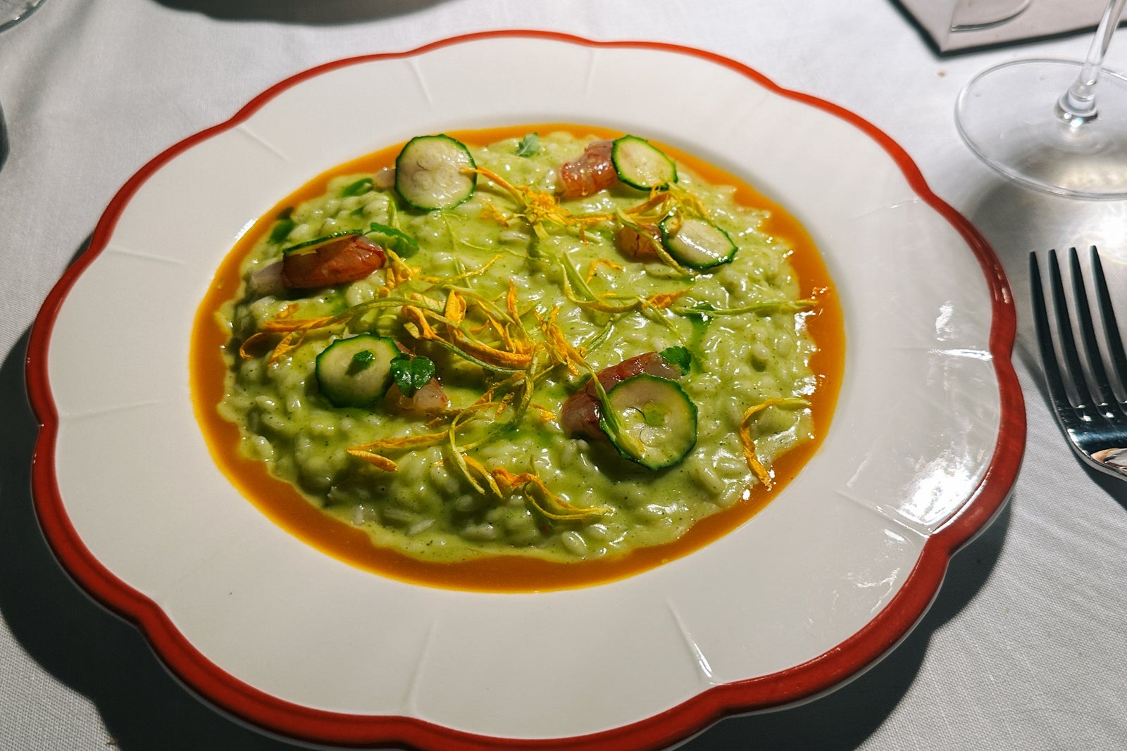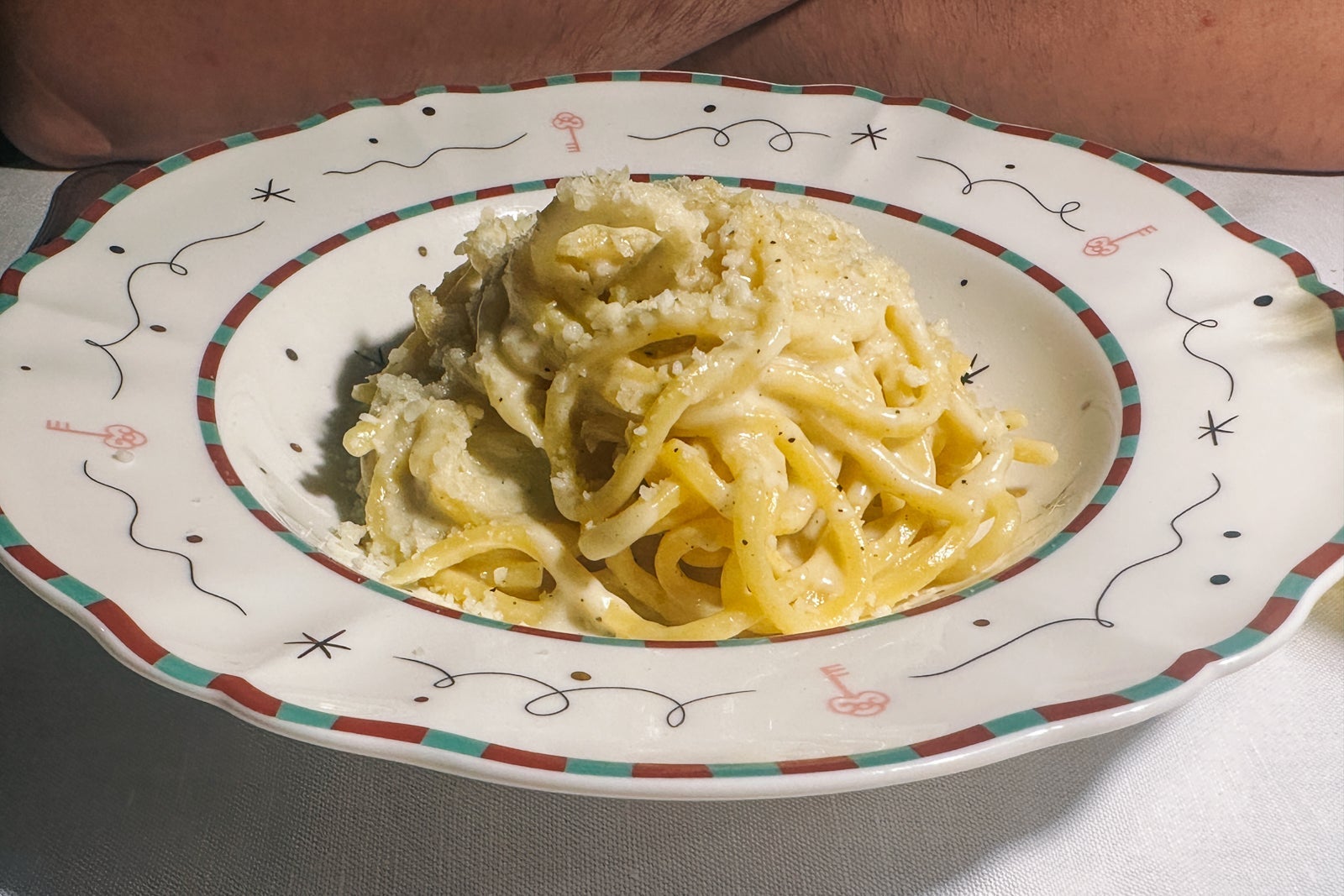 Highlights of our dinner included a mouthwatering caprese salad with burrata over a tower of fresh summer tomatoes and basil (16 euros/$17), a simple but delectable tonnarelli cacio e pepe (21 euros/$22), and a zucchini risotto with gambero rosso shrimp (30 euros/$32). The food was lovely, the service was great and we had a lovely time enjoying the fresh Roman air, even if it was a bit warm in late August.