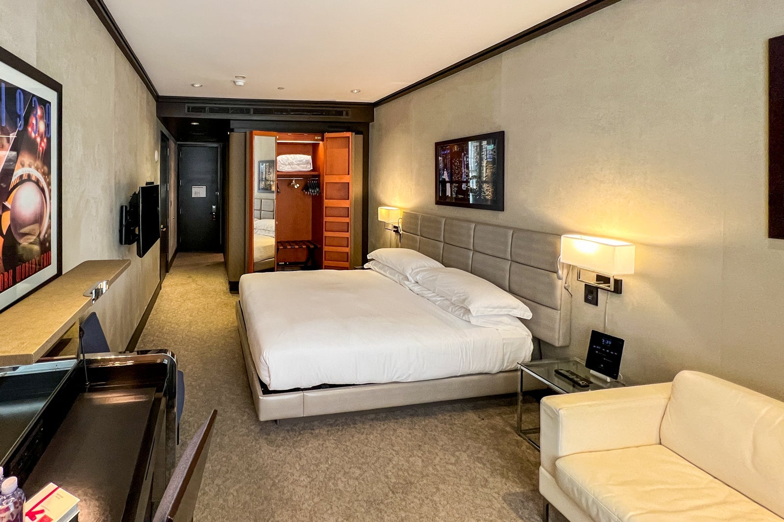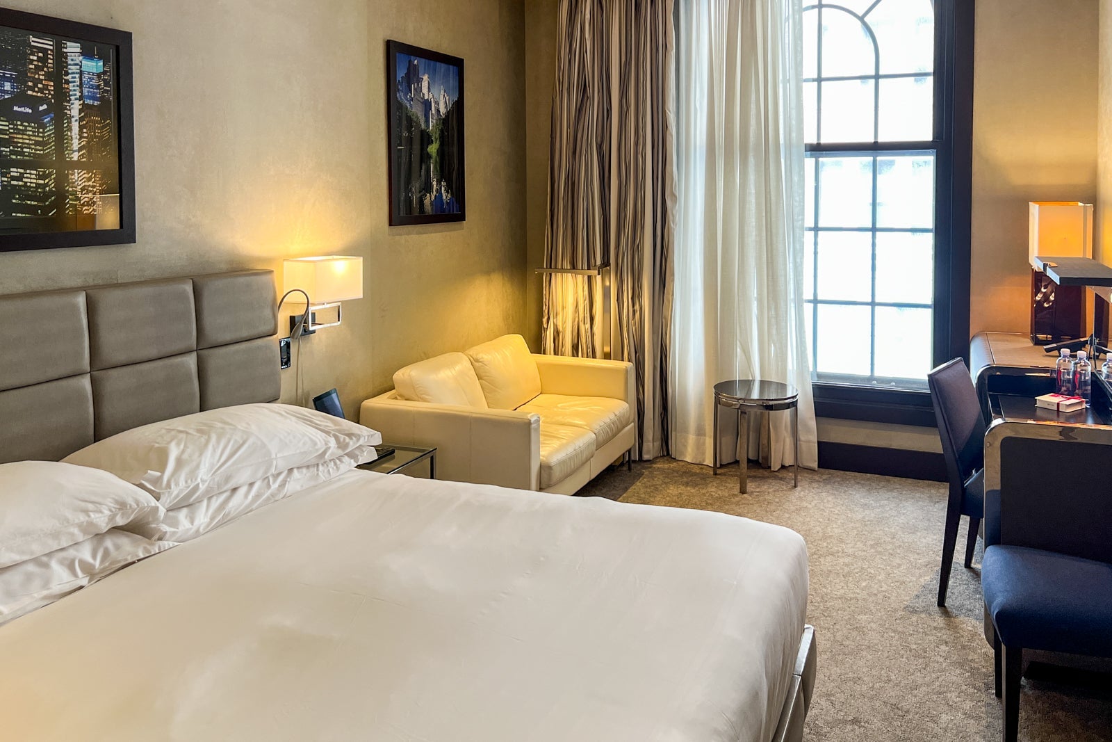 My upgraded room was a "Grand Deluxe" king facing 44th Street, measuring about 350 square feet. The only real upgrade from the entry-level king room I'd originally booked was a small loveseat and the street view.
