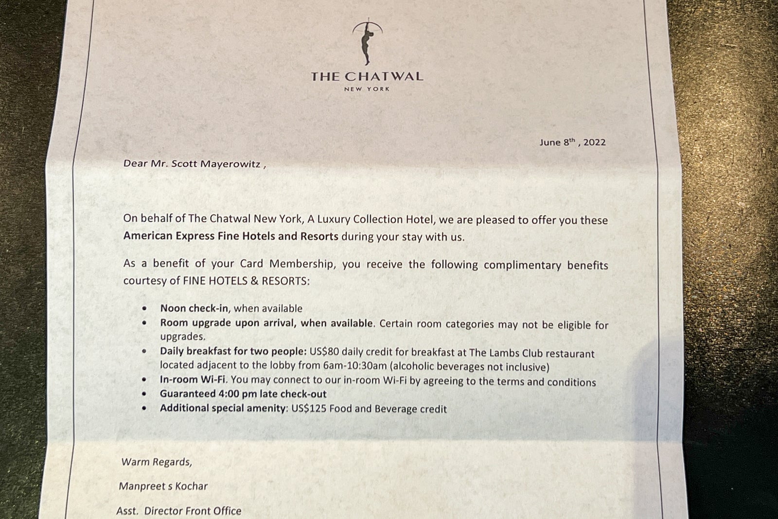 However, by booking via American Express I was offered a shot at a noon check in, guaranteed 4 p.m. check-out, daily breakfast for two people and a possible room upgrade. It also came with a $125 property credit, which I knew I would use for dinner at the hotel's popular restaurant, The Lamb's Club. Finally, there is an up to $200 annual credit for holders of The Platinum Card® from American Express for prepaid bookings via Fine Hotels + Resorts.