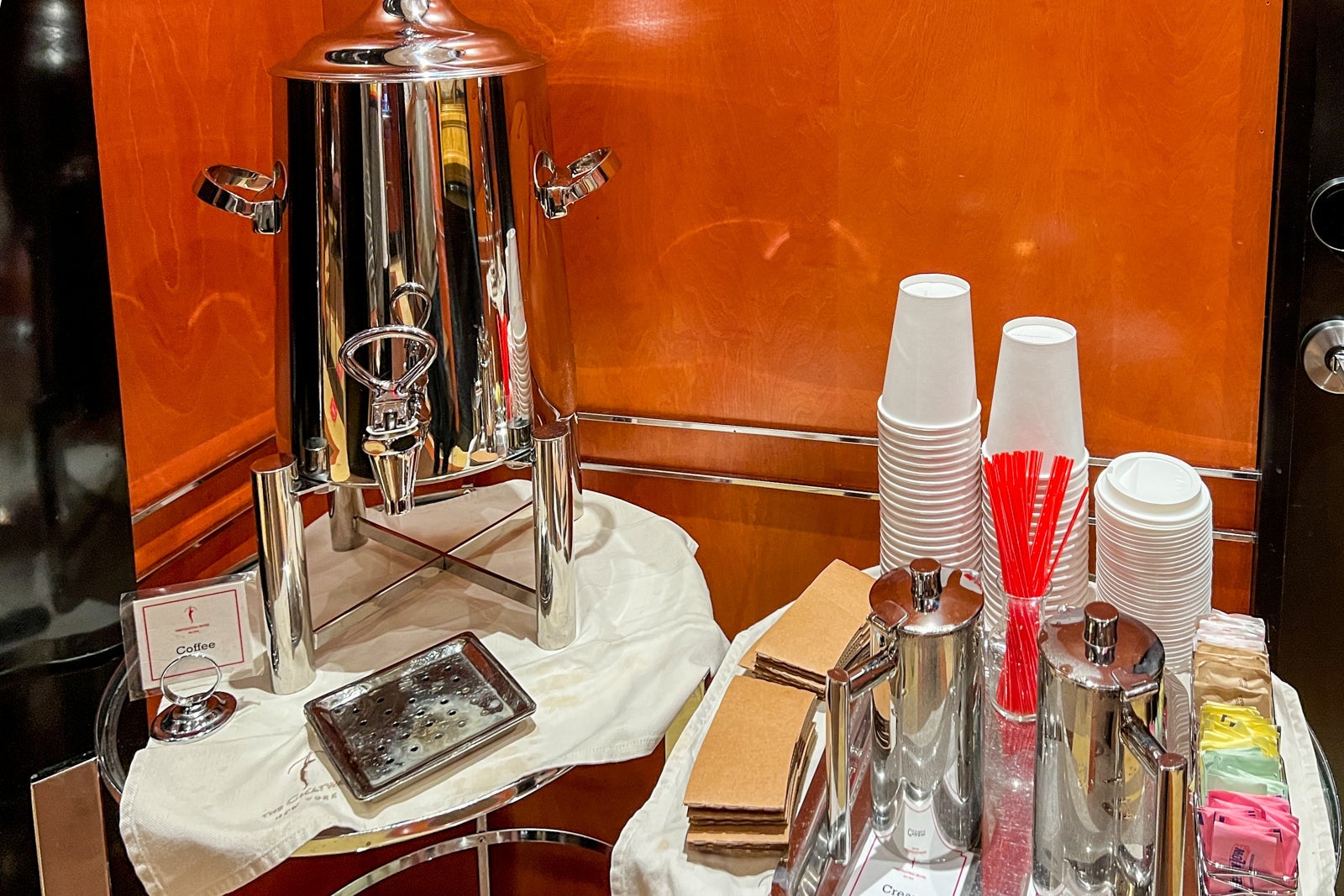 Breakfast the next morning back at Lambs Club, on the other hand, actually exceeded my expectations. My eggs were fluffy and flavorful, the orange juice was freshly squeezed and the potatoes were just the right level of crispiness. My coffee cup never went empty and the staff warmed up milk for my wife's coffee so it didn't cool the drink down too much — a nice little touch. (For those not having breakfast at The Lambs Club, there is free coffee in the lobby near the elevators.)