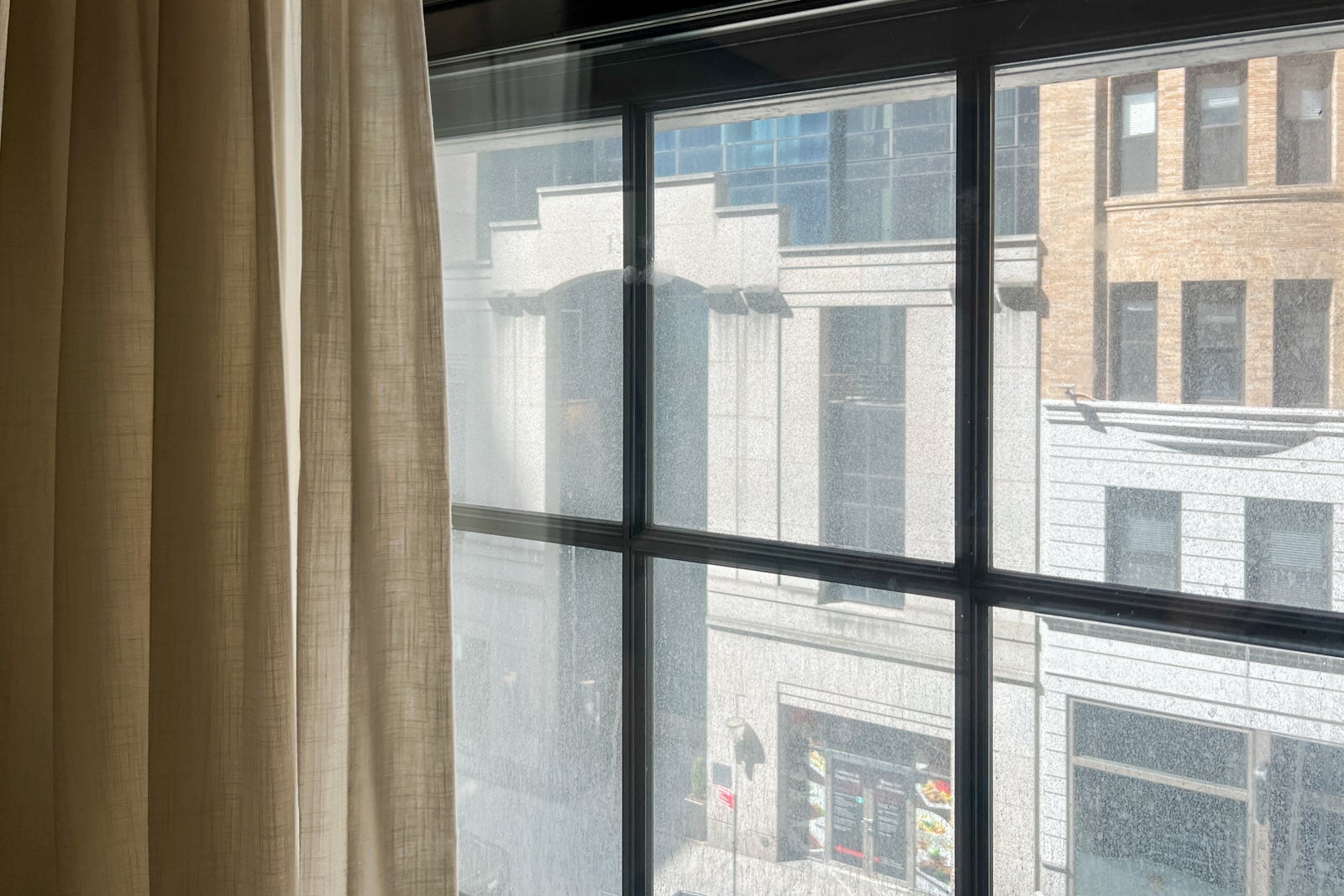 Then I looked at the rest of the room and it was — well, just fine. It was clean and comfortable but not exactly luxurious or posh enough to justify a $700-plus nightly rate. The desk and loveseat had seen better days; there were scuffs and nicks all over. The room felt very cramped, even by New York City standards. It was technically large but none of the furniture was really inviting, making it just feel smaller. A thick layer of grime on the windows darkened my view of the street below.