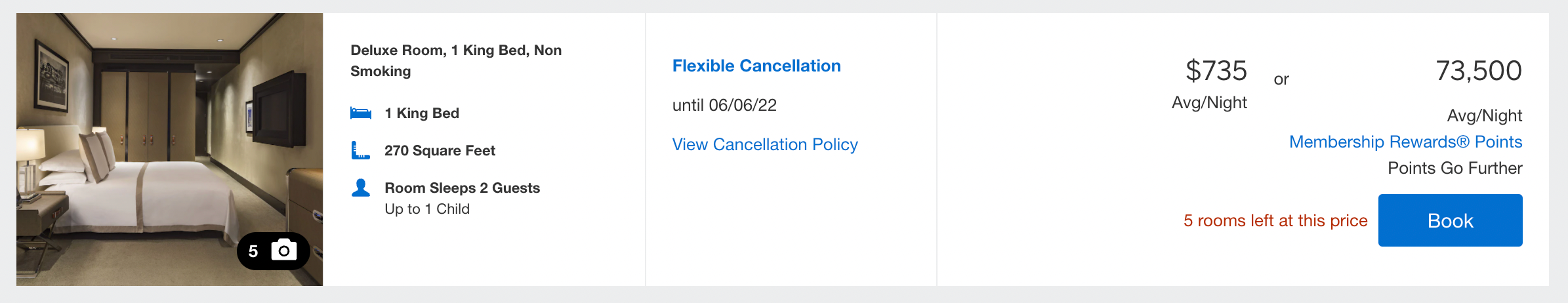 The base rate was $735 for a deluxe king room measuring about 270 square feet. Booking the same room directly via Marriott, as a Bonvoy member, would have been $720.