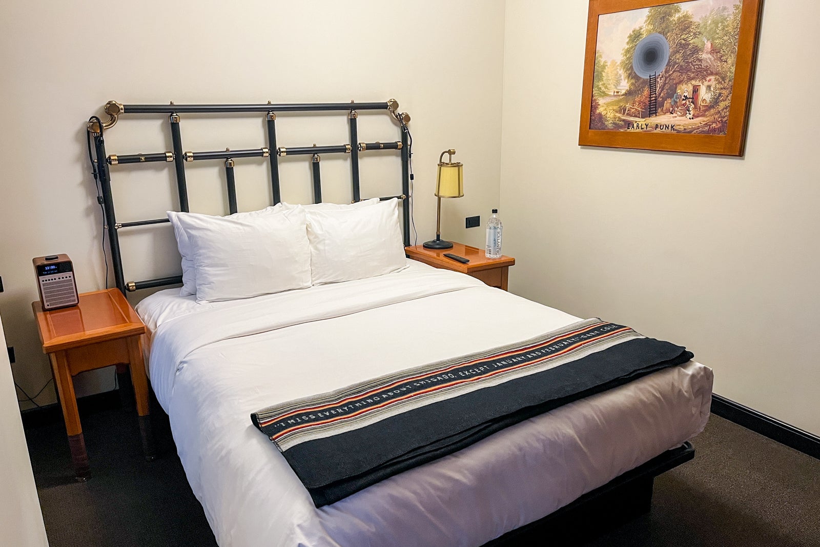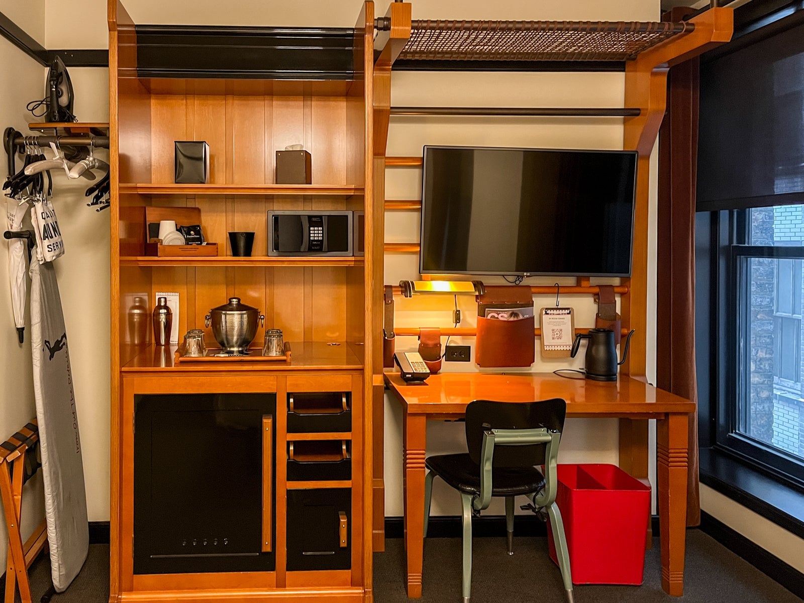 The room served as an homage to the building's history, offering subtle nods to the property's athletic roots in the decor and amenities, such as the 42-inch flat-screen TV and a work desk. There were brass fixtures and vintage athletic gear, and I was low-key obsessed with the humorous artwork. Some of the furnishings could benefit from a refresh, though, as I noticed nicks on the nightstand and the bathroom door.