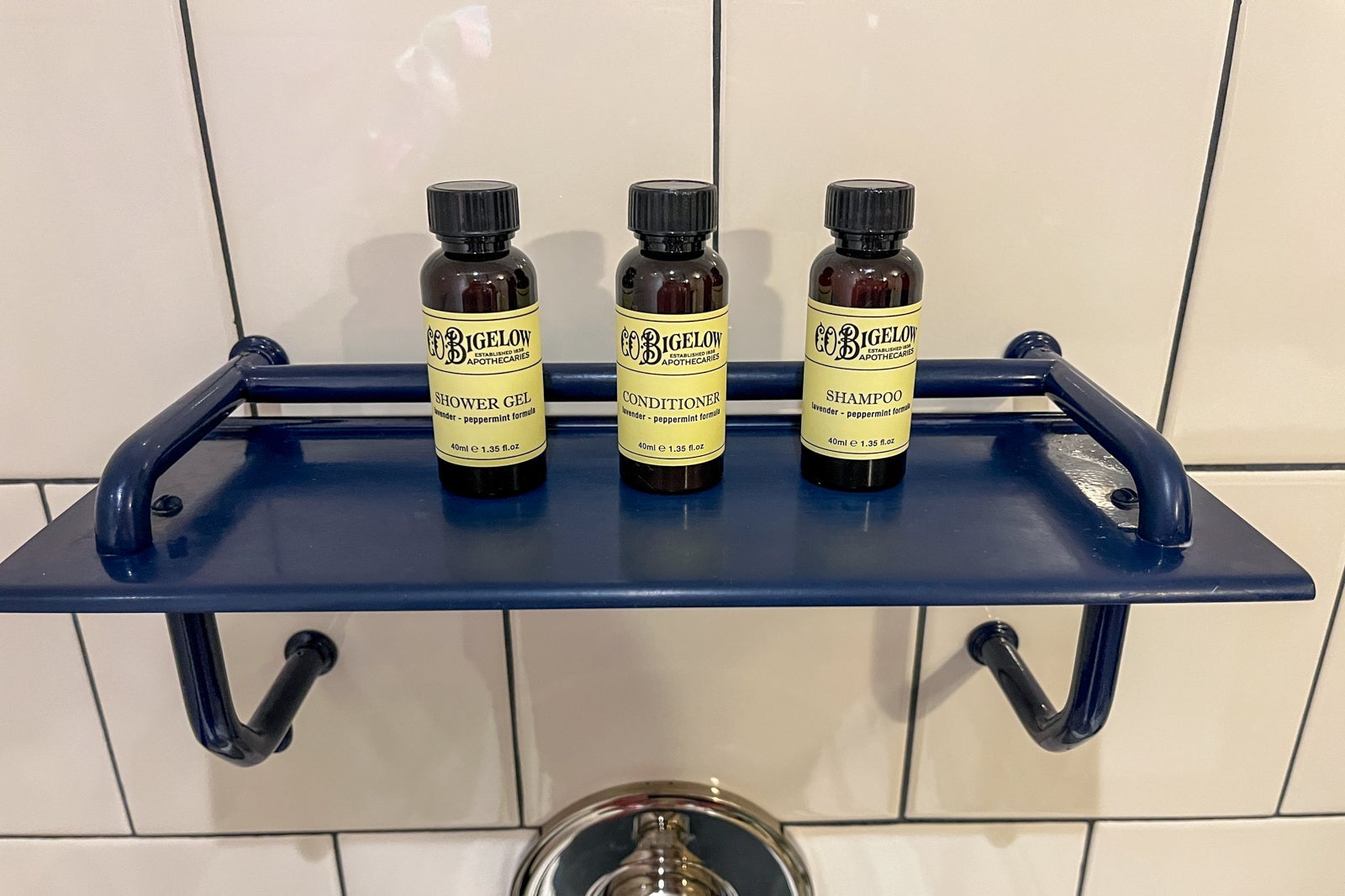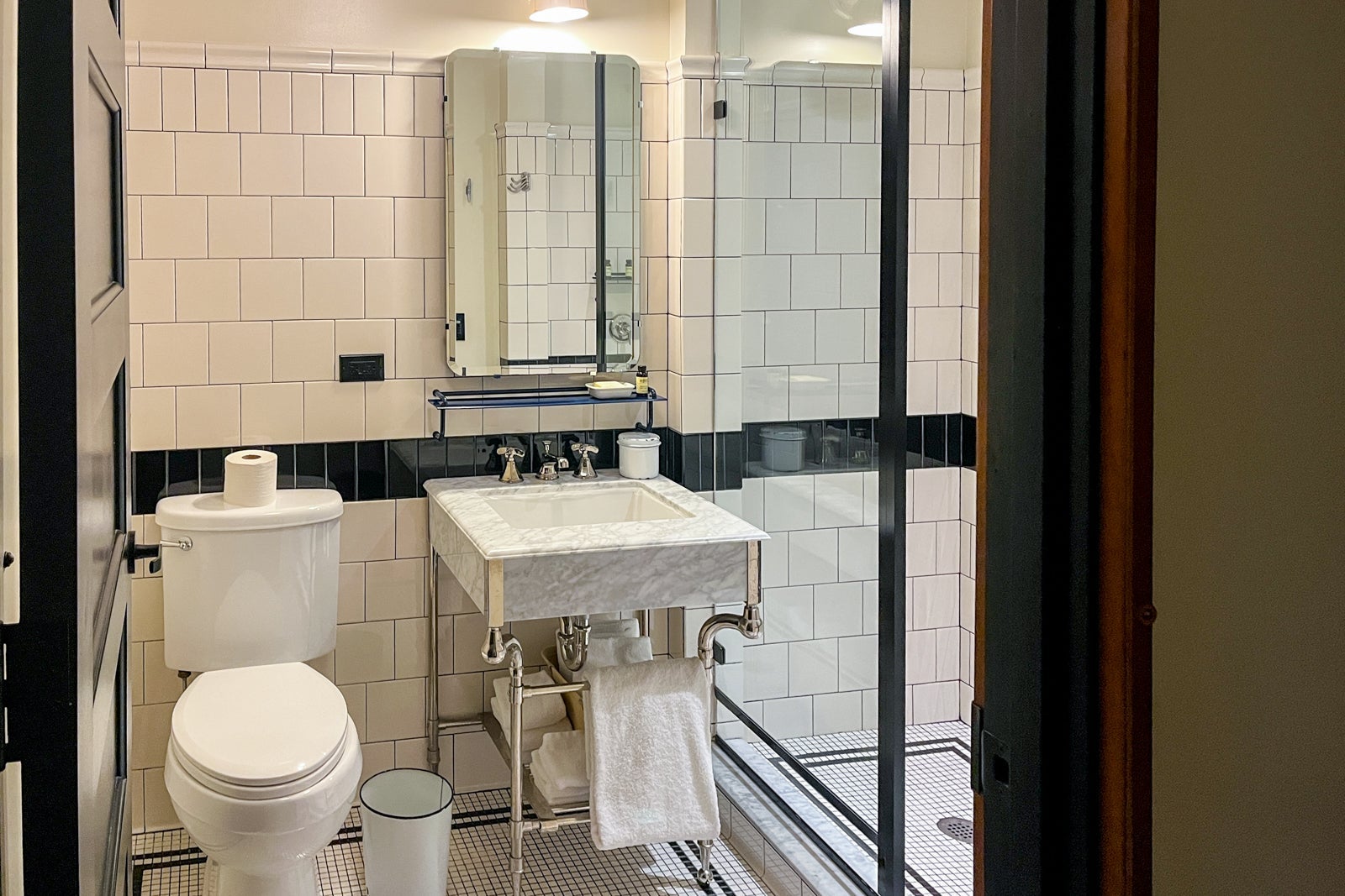 The walk-in shower was spacious, though, and came outfitted with C.O. Bigelow toiletries. The black-and-white design featuring walls of subway tile was on brand for a vintage athletic club.