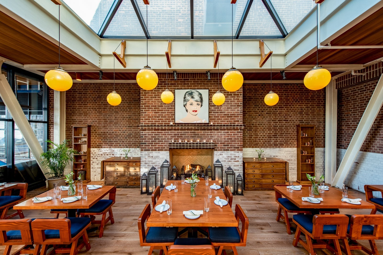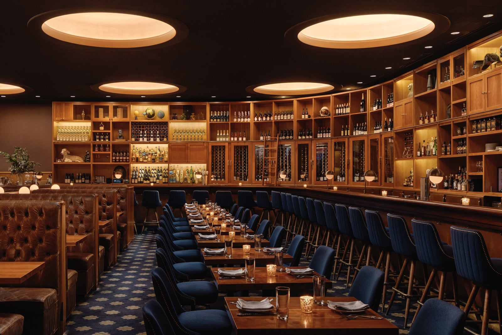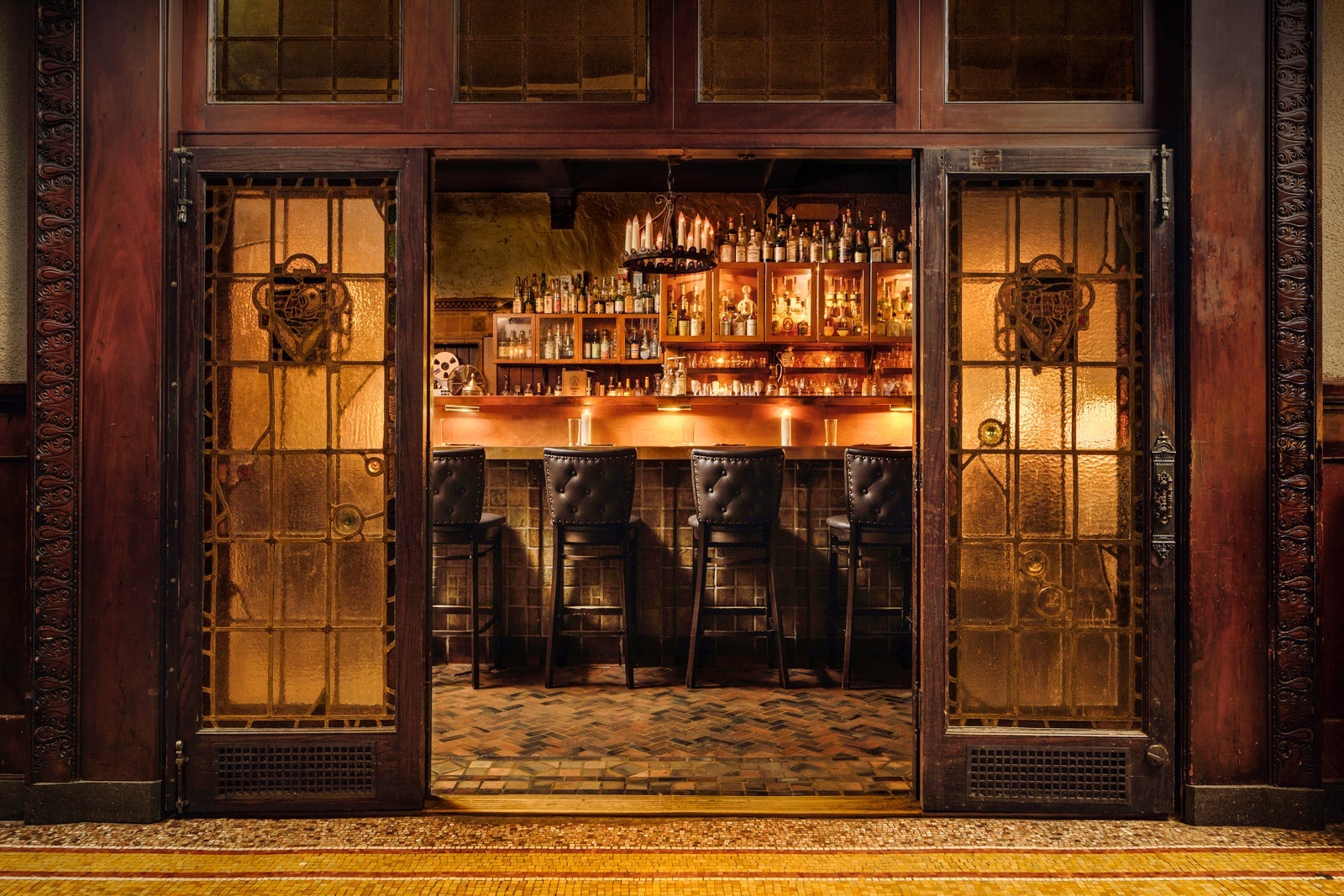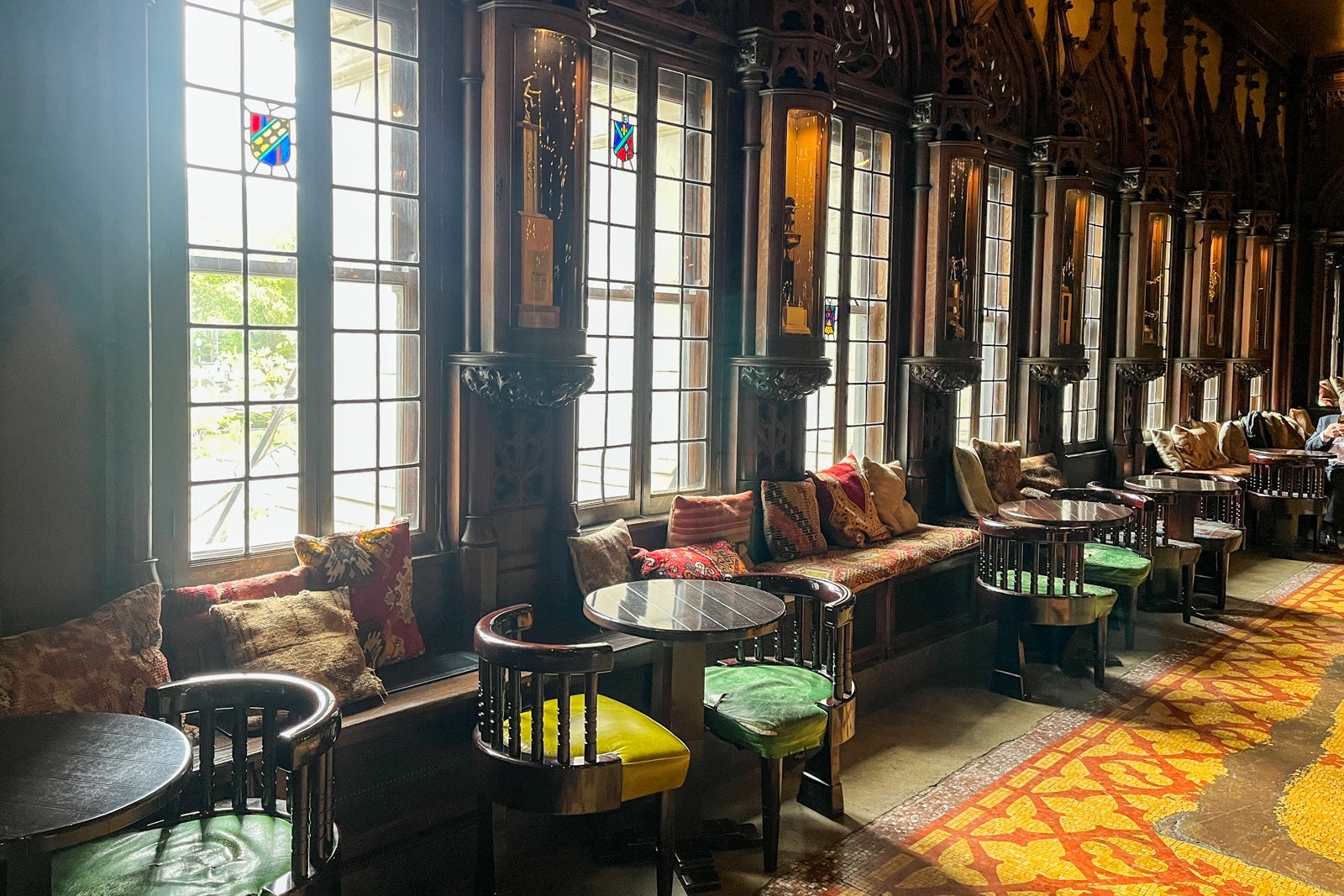 Couples and friends huddled in oversize leather couches, chatting over cocktails or coffee, and spectacular carved stone fireplaces, elaborate millwork, stained-glass windows and terrazzo floors created an opulent, intimate atmosphere you would expect at an exclusive club.