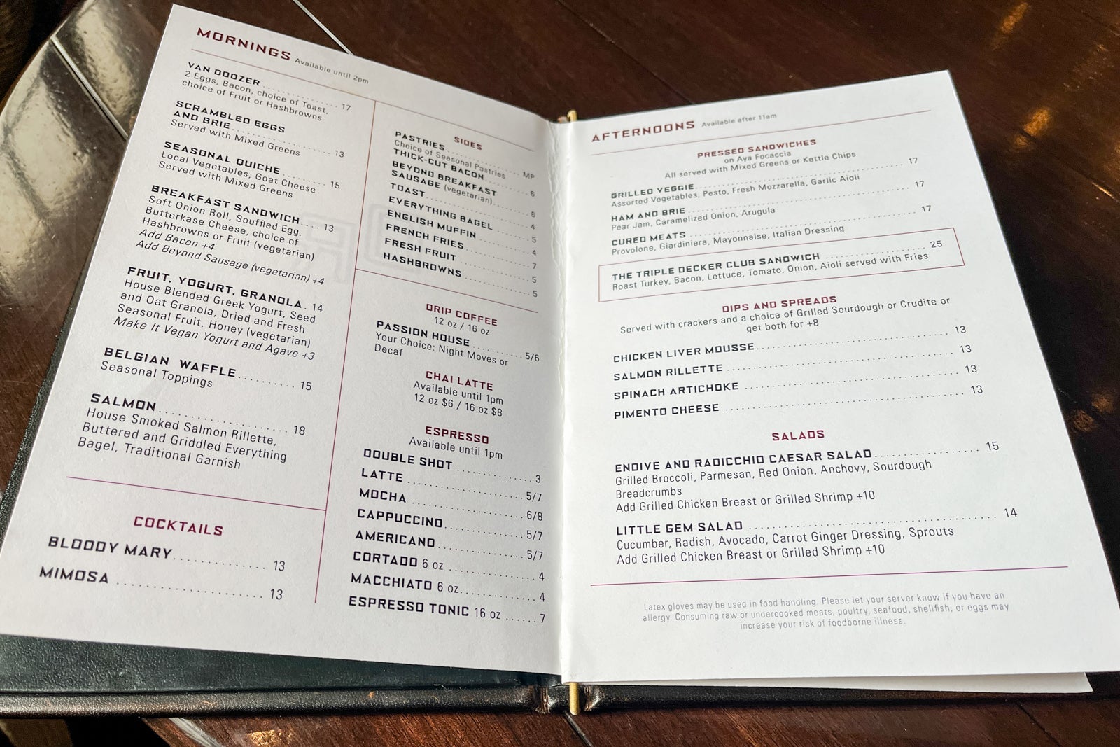 Menu staples during my visit ranged from morning classics like Belgian waffles and breakfast sandwiches to various sandwiches, dips and salads to enjoy later in the day. I ordered the grilled veggie sandwich on focaccia bread, which came with mixed greens, for $17. The portion was perfect, and I found the combination of vegetables, pesto, garlic aioli and mozzarella cheese to be very tasty.