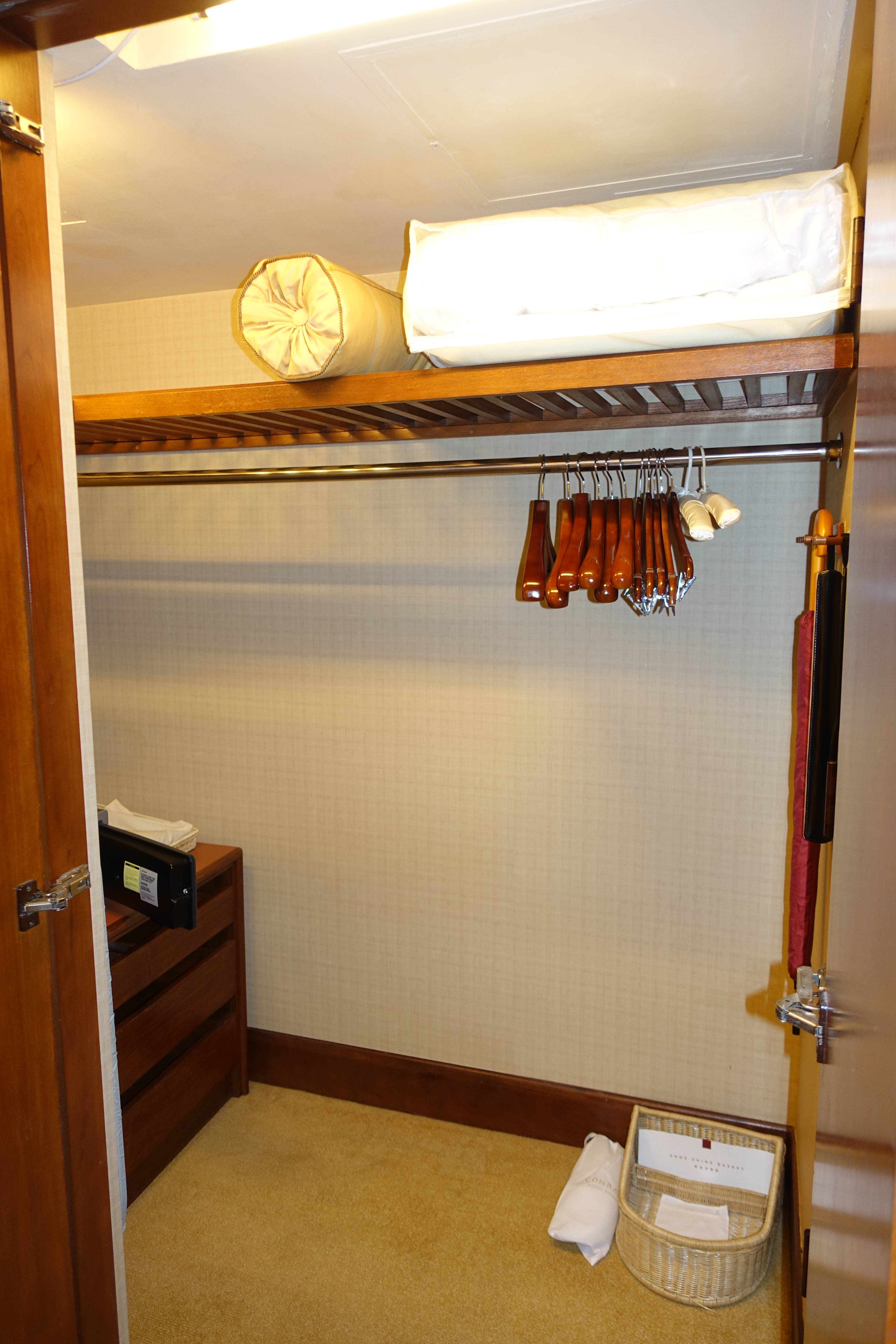 All the usual suspects were there: a large TV, slippers, robes, free bottles of water, fully stocked minibar and huge closet with a safe, hangers, iron and board and umbrella. Daily turndown service was a nice touch, leaving us more water bottles and closing the shades.