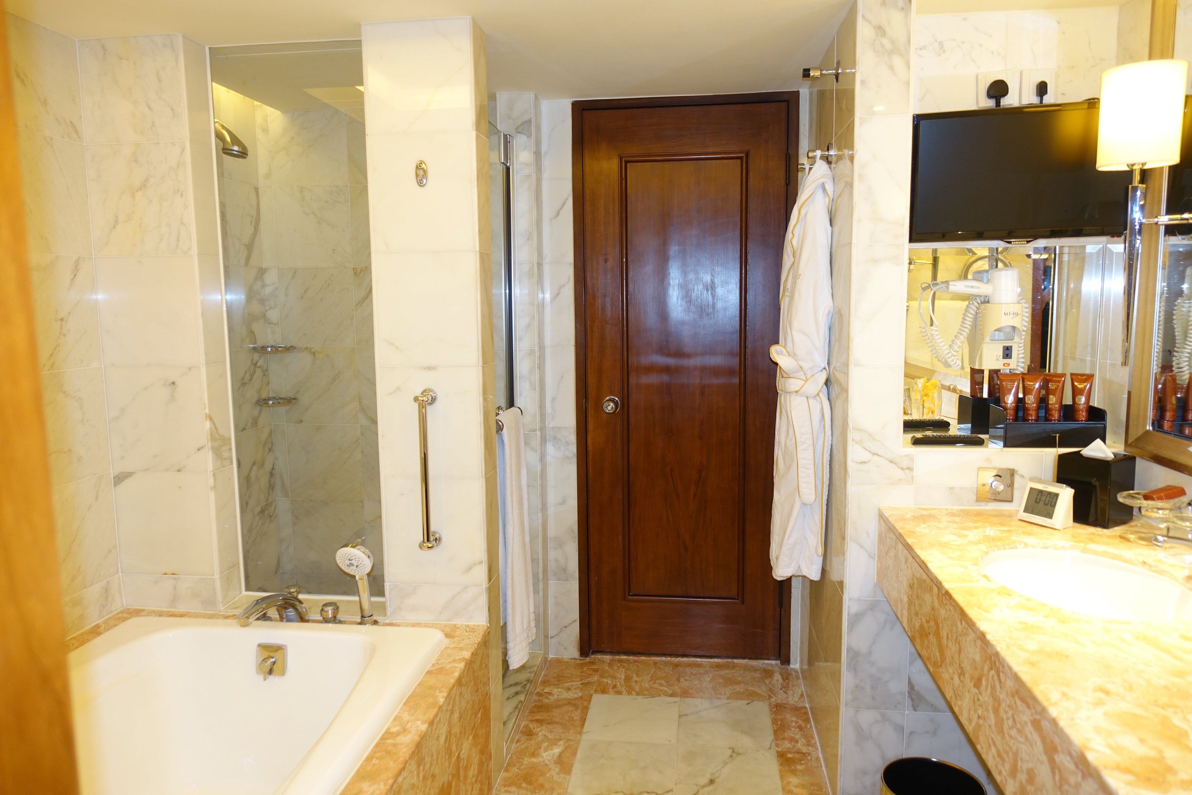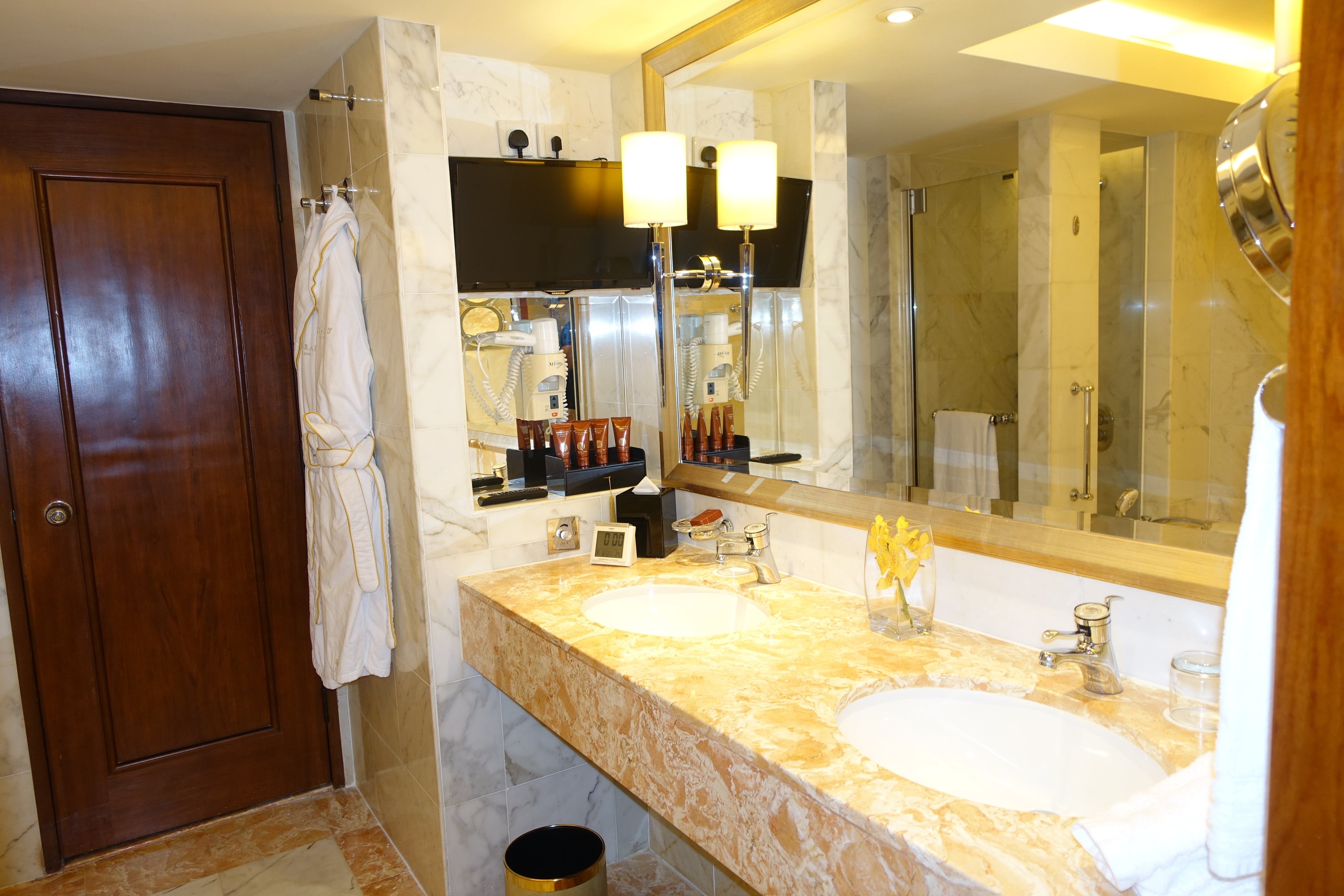 The bathroom had double marble sinks and a larger-than-average bathtub complete with Shanghai Tang amenities and a second television.