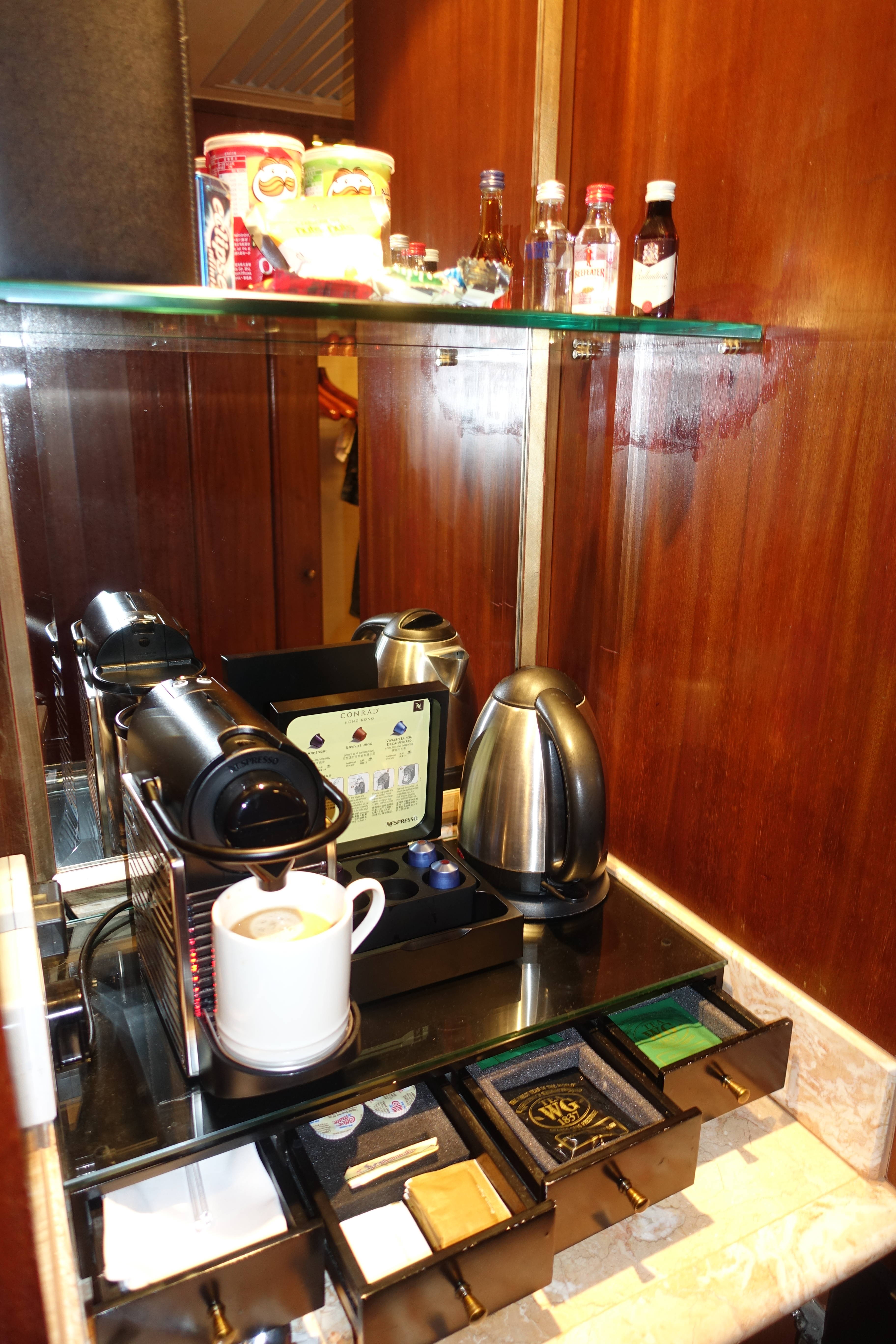 I was thrilled to see that there was a Nespresso machine (a real jet-lag cure) that came with free capsules. I spotted several outlets near the desk but had to unplug the lamp in order to plug my phone in.