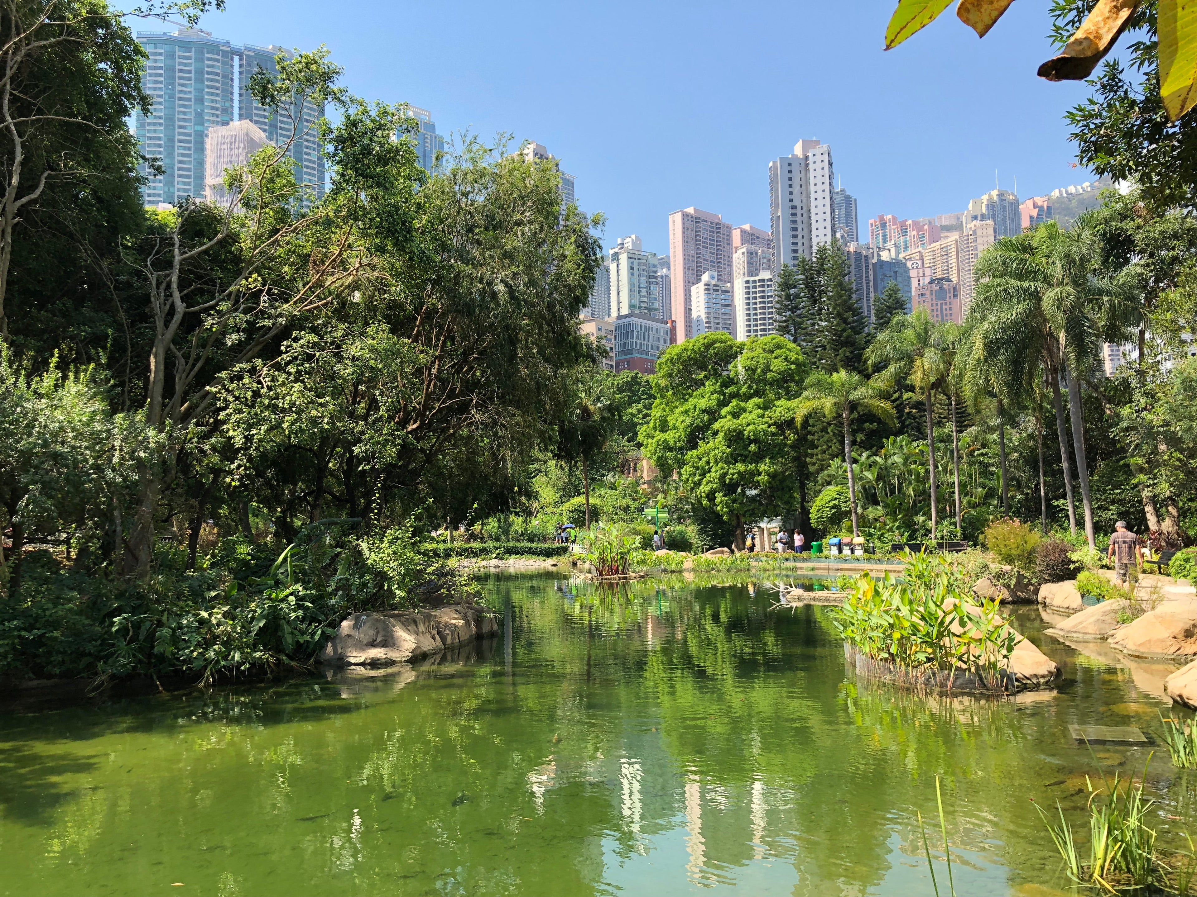 The Conrad Hotel was on the Hong Kong island side of the harbor next to Hong Kong Park, between the Central and Wan Chai districts. Being near the park was beautiful, and I enjoyed checking out the fish ponds and the tai chi gardens beneath the greenery of the trees. Daily park strolls were a great way to combat the jet lag. It was about a 20-minute walk from the park up to the Victoria Peak tram, which was also convenient.