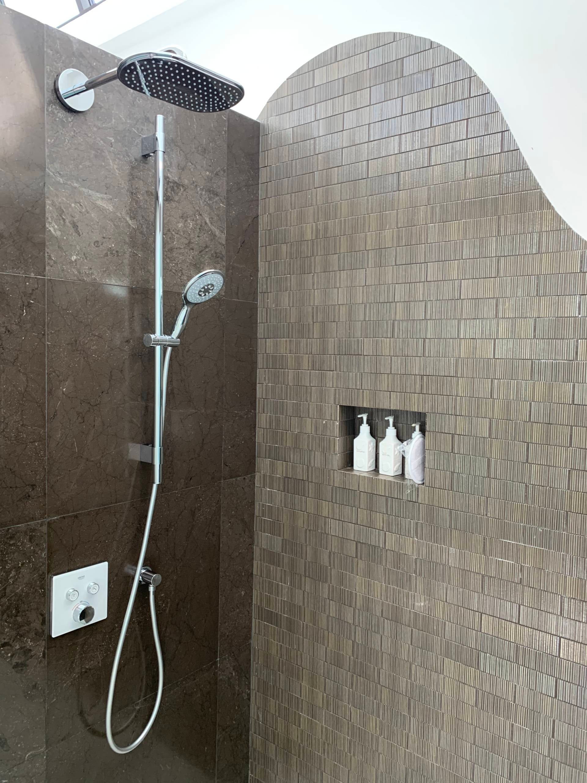 The shower spacious and beautiful, and the rainfall shower head would definitely pass the TPG shower test.