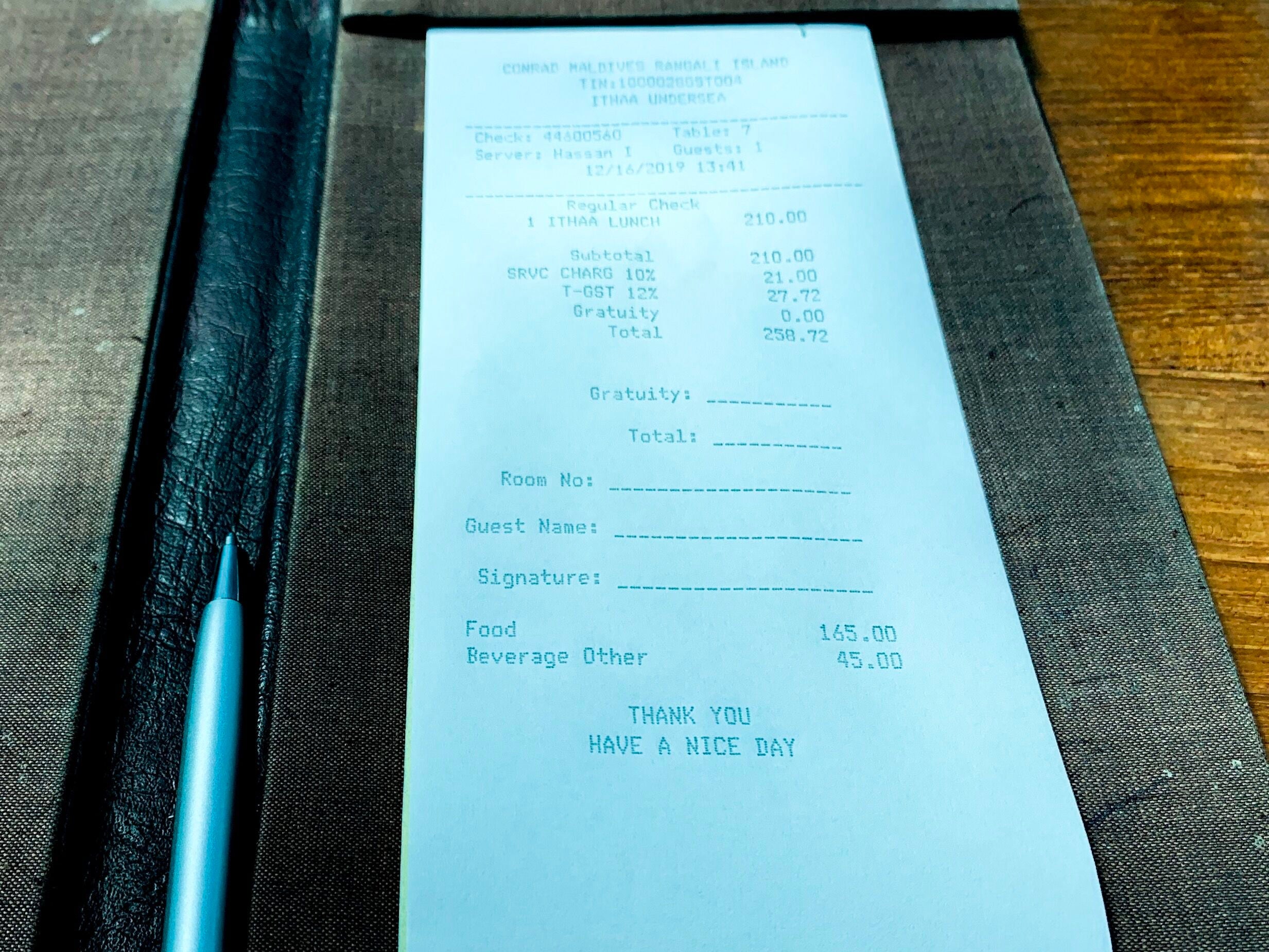 It's also important for your budgeting to understand that the Conrad Maldives is on an island, Rangali, that is literally in the middle of the ocean. No restaurants are nearby, you can't just pop down to 7-11 for a soda or Uber to the nearest shopping mall. Your time will be spent at the resort (which is stunning, by the way), all your meals and activities will happen at the resort -- and you'll pay a lot for them.