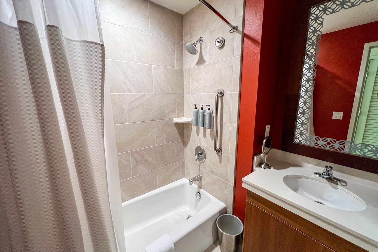 Entry-level rooms at this Courtyard are not only ideal for sleeping; they also have an ingenious bathroom design that includes two showers in different sections of the bathroom. In the vanity portion is a tub/shower combo, while the room with the toilet has a stand-up shower.