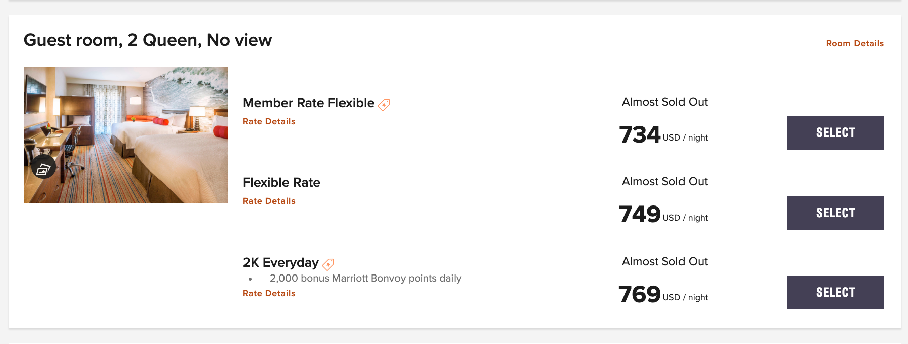 Based on my searches, staying here will require spending anywhere from 50,000 to 74,000 Marriott points per night for a standard room. And yes, as you may expect, lots of nights during the fall and winter months — especially around the holidays — cost at least 70,000 points per night.