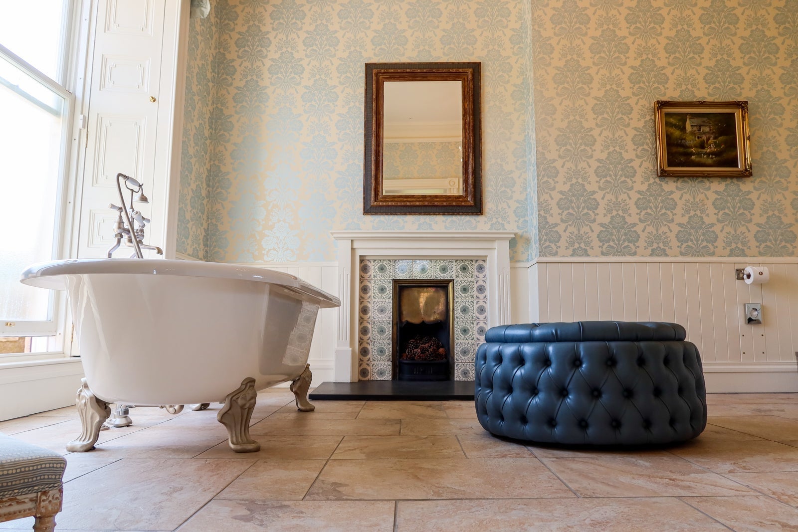 Honestly -- a fireplace, a chandelier, a freestanding claw-foot bathtub and a giant ottoman in a bathroom?