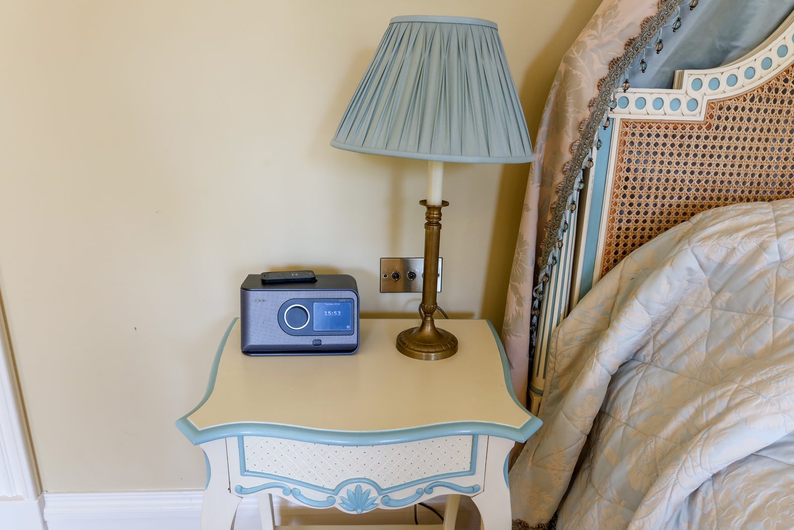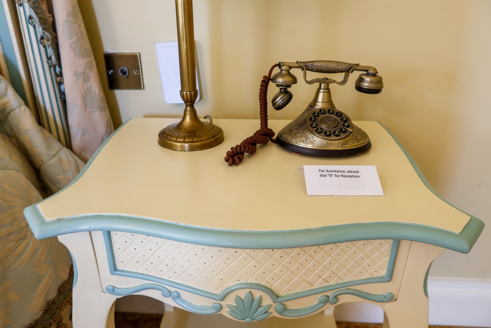 Next to the bed was a mix of old and new items -- an antique phone on one side, with an alarm clock on the other side.
