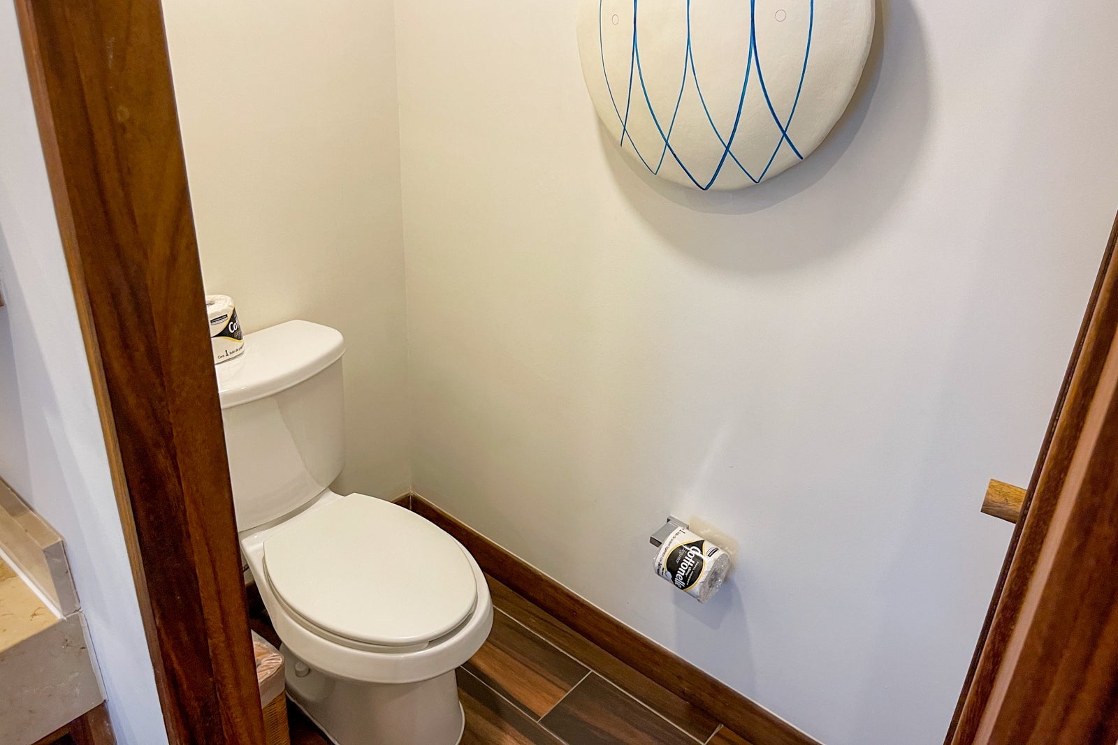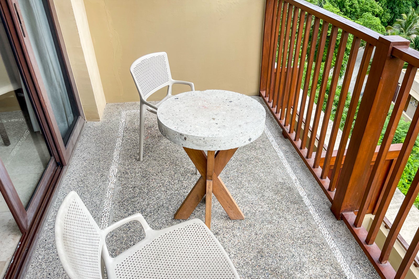 Just beyond the sleeping area was a balcony outfitted with a wood-and-stone table and two metal chairs. While the chairs weren't comfortable, the balcony was a nice place to take in the lush setting when we wanted some fresh air.