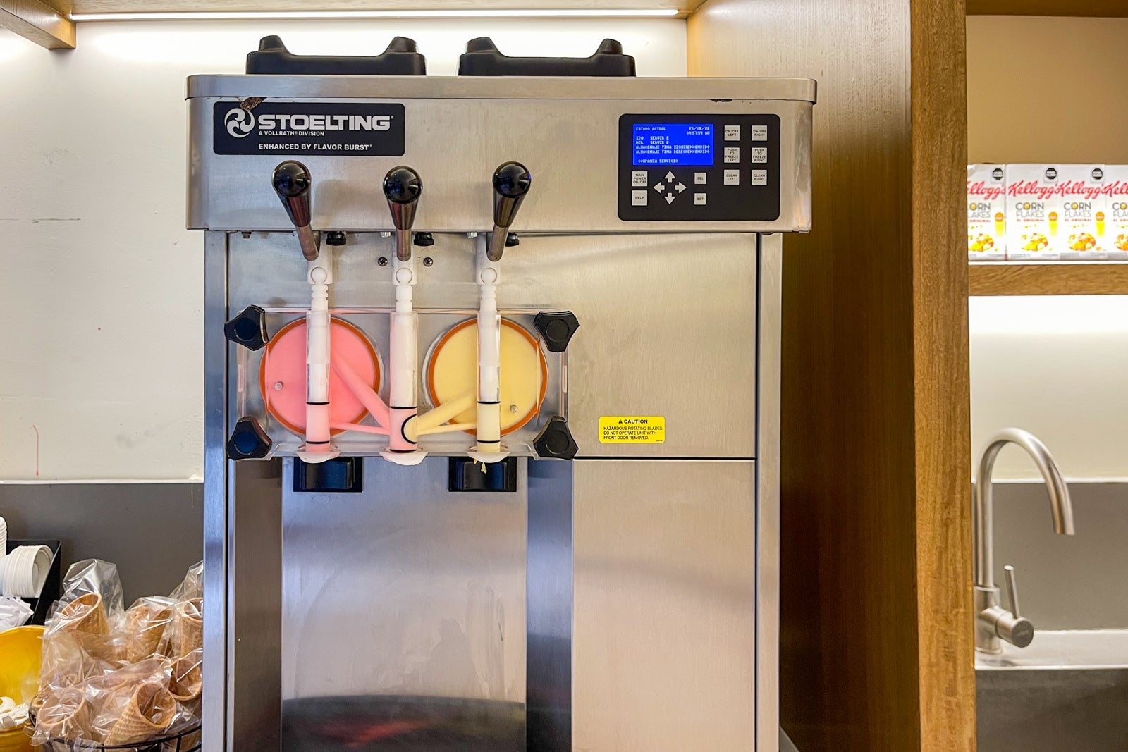 Next to the entry door, there was a mini fridge stocked with complimentary soda, juice and water, plus a coffee maker. There was also a small closet with space to hang a few items.