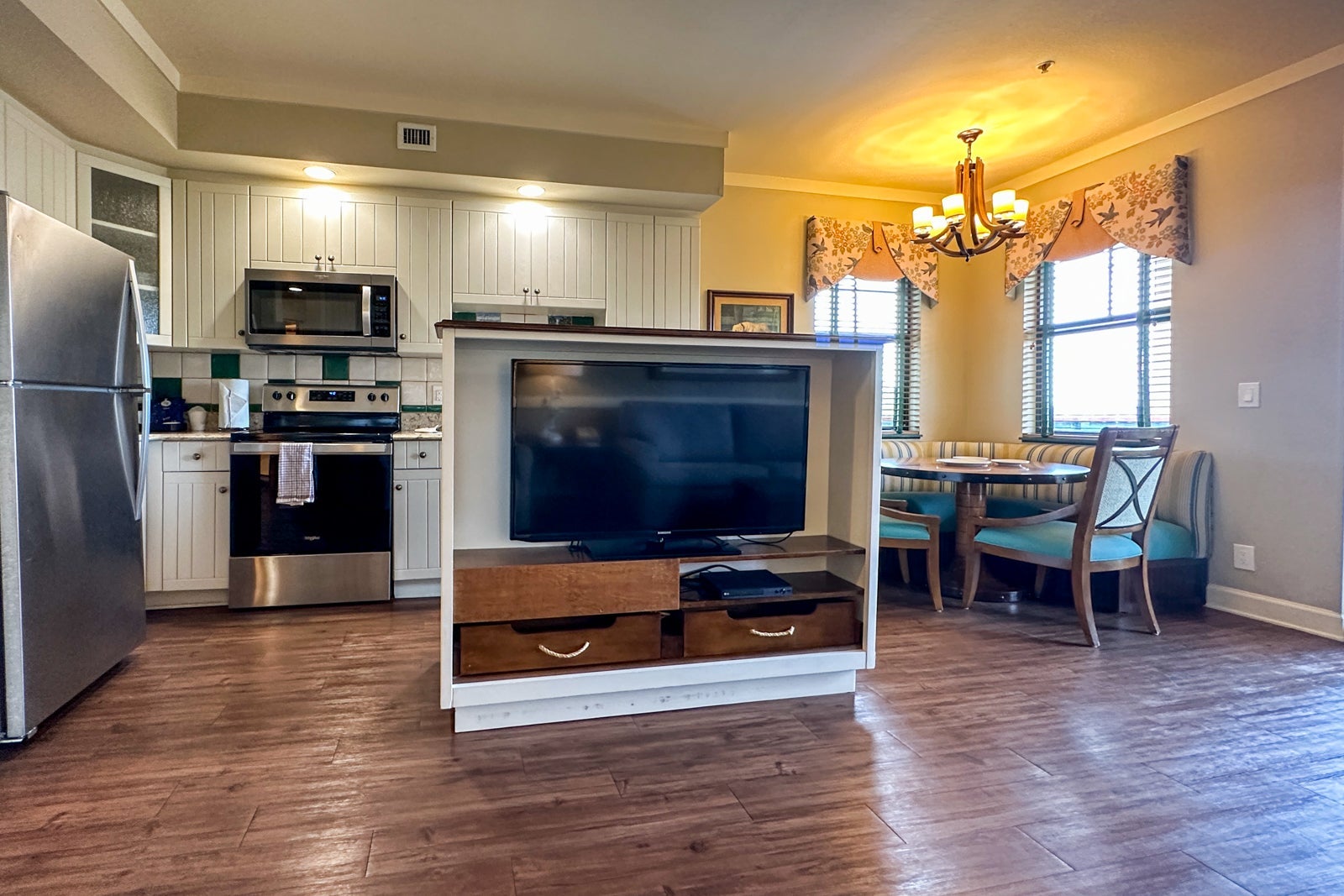 There are three room types available at Disney's Hilton Head Island Resort. Deluxe Studio rooms are similar to any standard hotel room, with a shared living and sleeping space, a kitchenette and a balcony. One- and two-bedroom villas have a full-size kitchen, separate living and dining area, full-size washer and dryer, and both a shower and whirlpool tub in the bathroom (two-bedroom villas have two bathrooms).