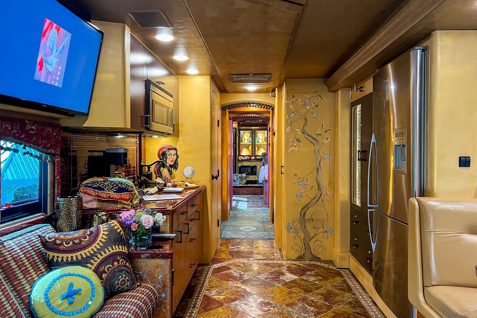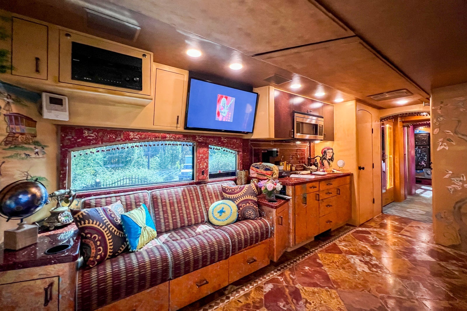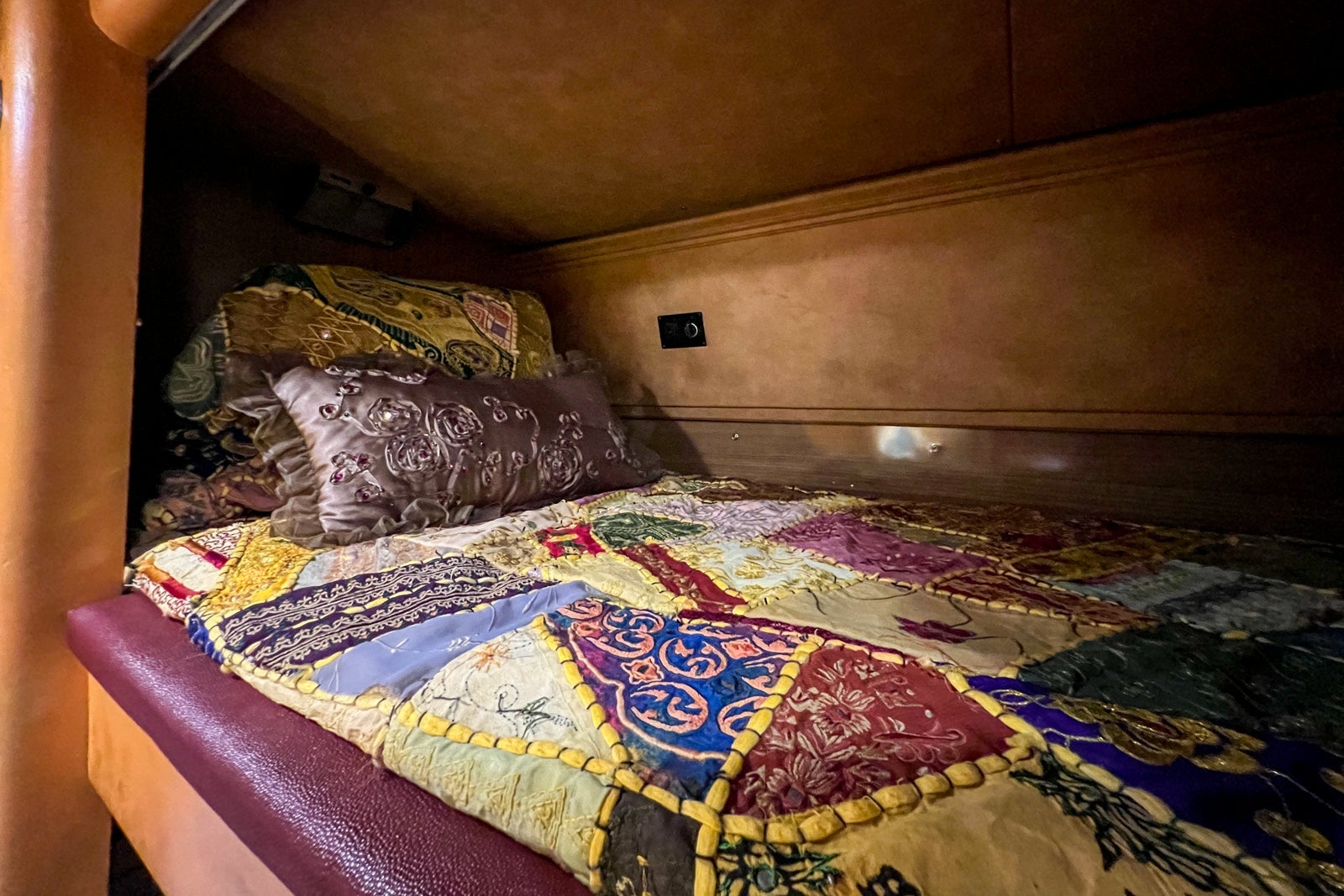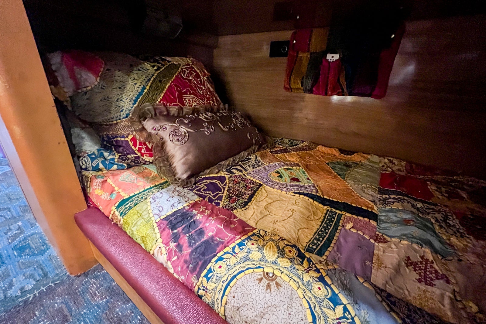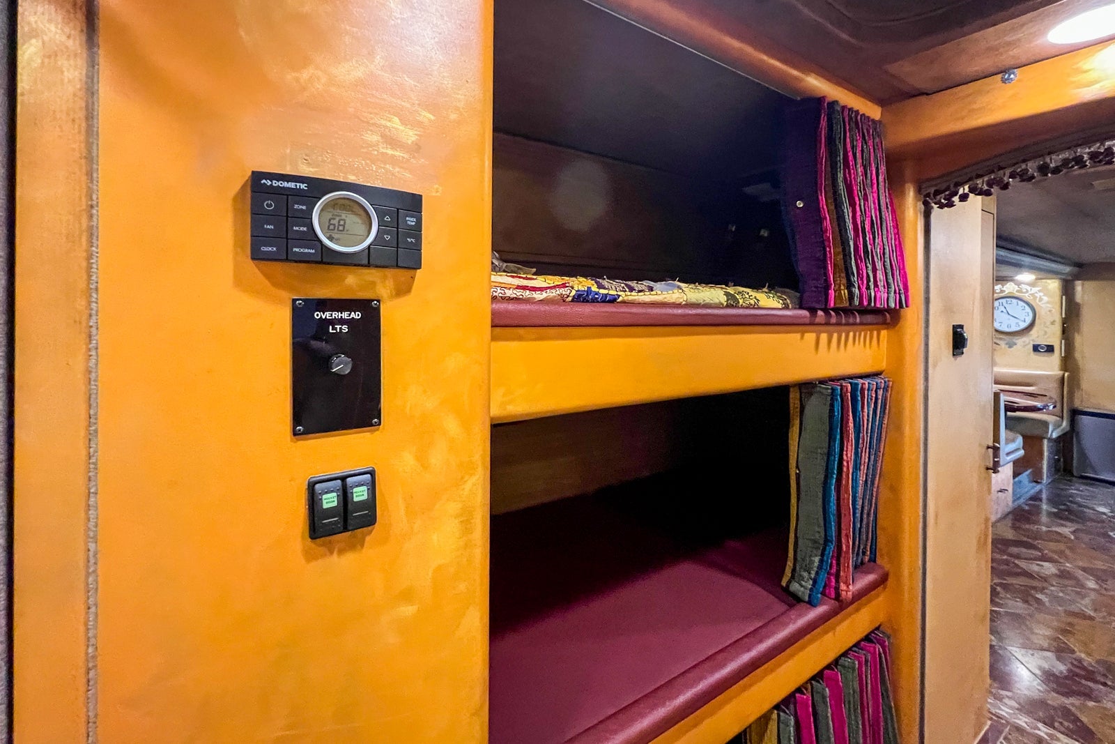One fun thing Dolly installed was a trio of electronic pocket doors that separated the bus into four distinct areas, the second of which was where three bunkbeds were stacked for her travel companions. In those windowless bunks, guests could catch some shut-eye in privacy by closing multicolored, velvety curtains or catch up on their favorite shows by flipping down an in-ceiling television.