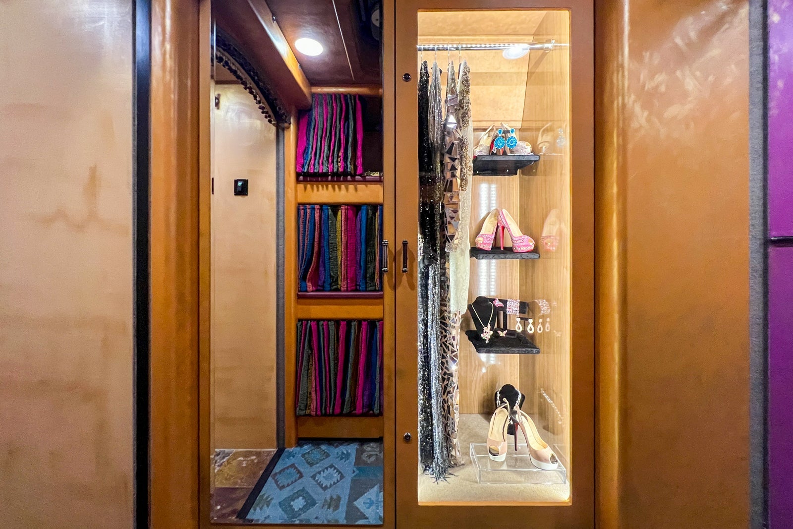 On a regular tour bus, the opposite wall would likely have more bunks — but this is Dolly we're talking about. She had that wall retrofitted into a closet to hold her sequined dresses and, obviously, her wigs, of which she's said to have one for every day of the year.