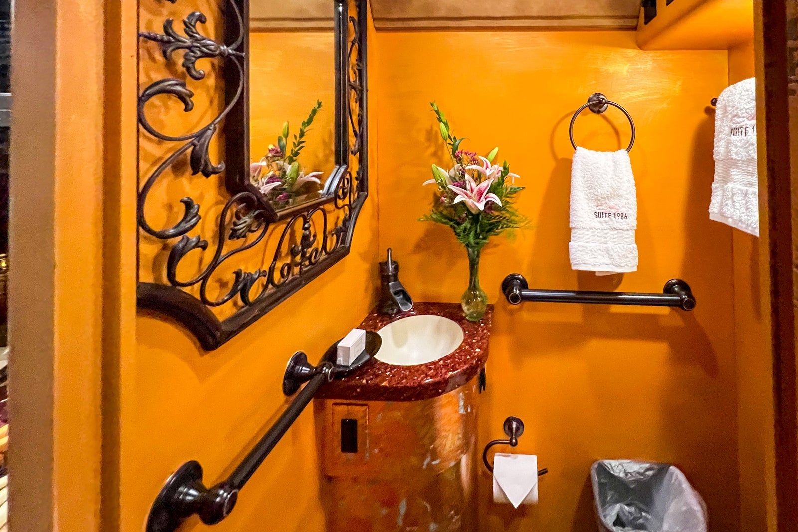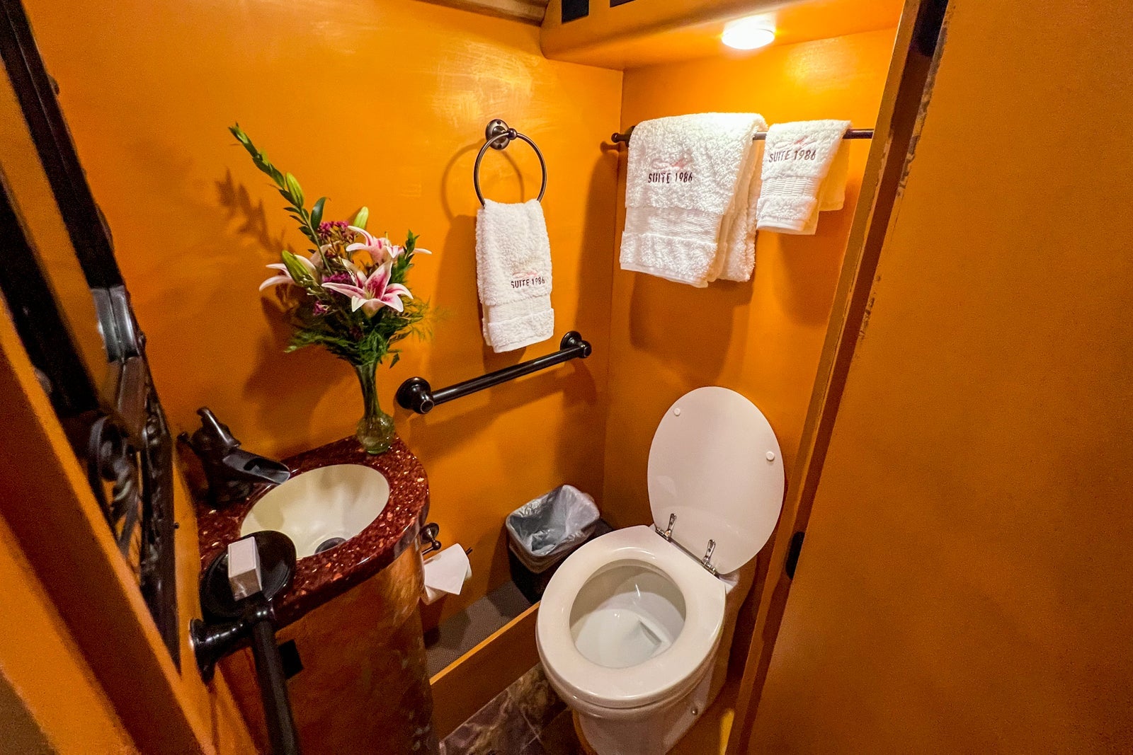 The bathroom was tiny. Very tiny. But also beautiful and very Dolly. In a shoebox-size, bohemian space to the side was a toilet, orange velvet curtains hiding the storage area, golden candle sconces, a tiny sink in the corner and even toilet paper embossed with "Suite 1986."