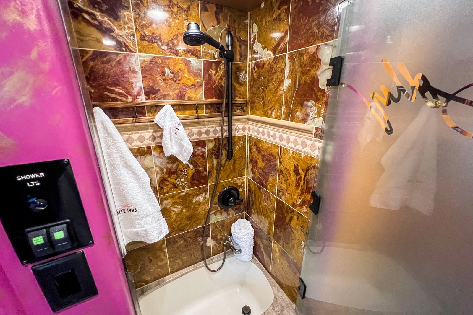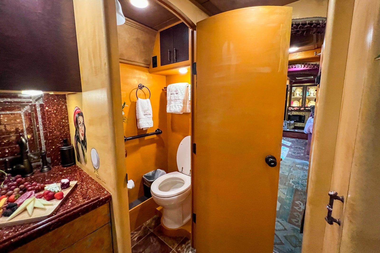 Passing through the next pocket door, I realized I was entering a sacred space: Dolly's private bathroom (two bathrooms on one bus!) and bedroom, all highly customized to be her sanctuary on the road.