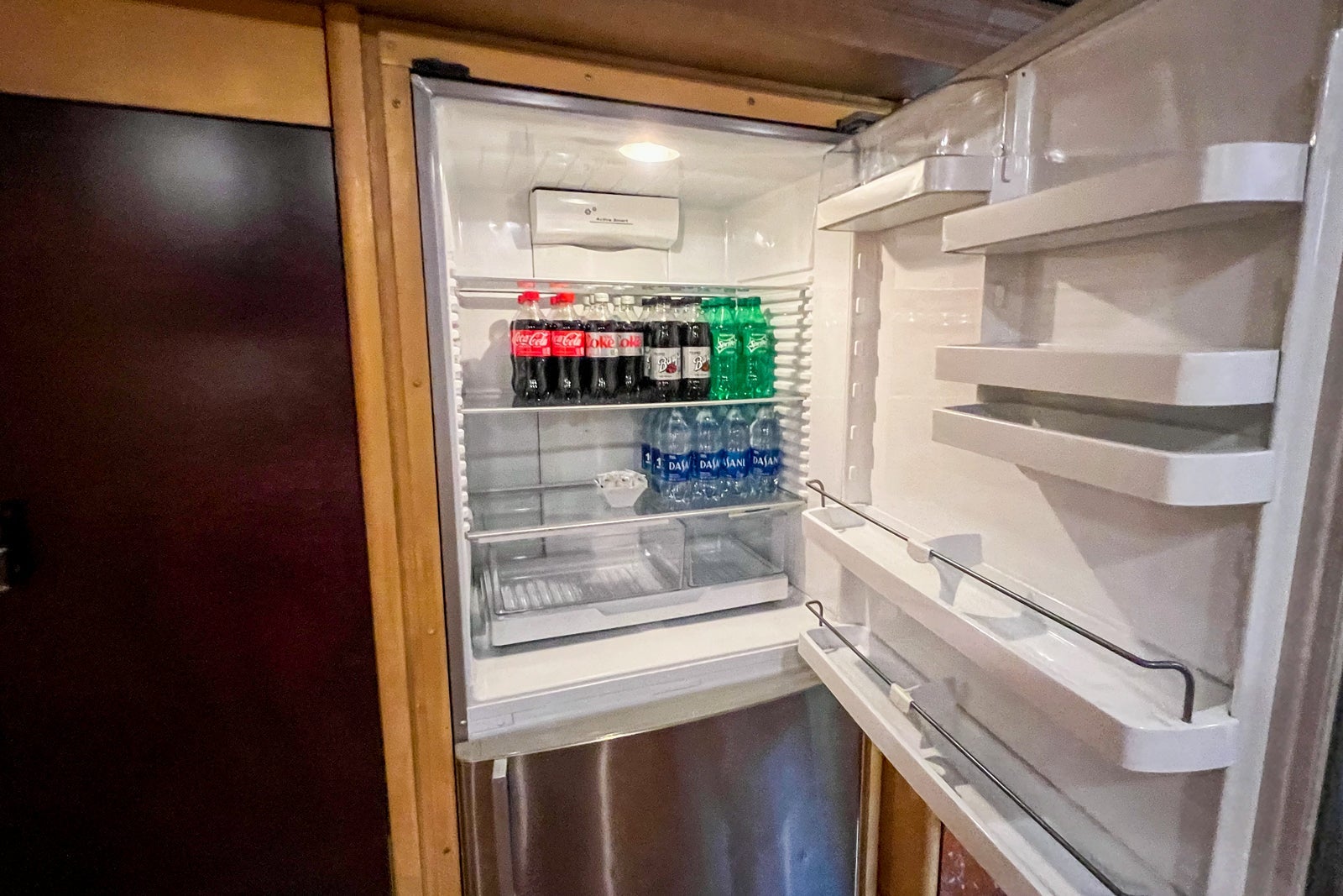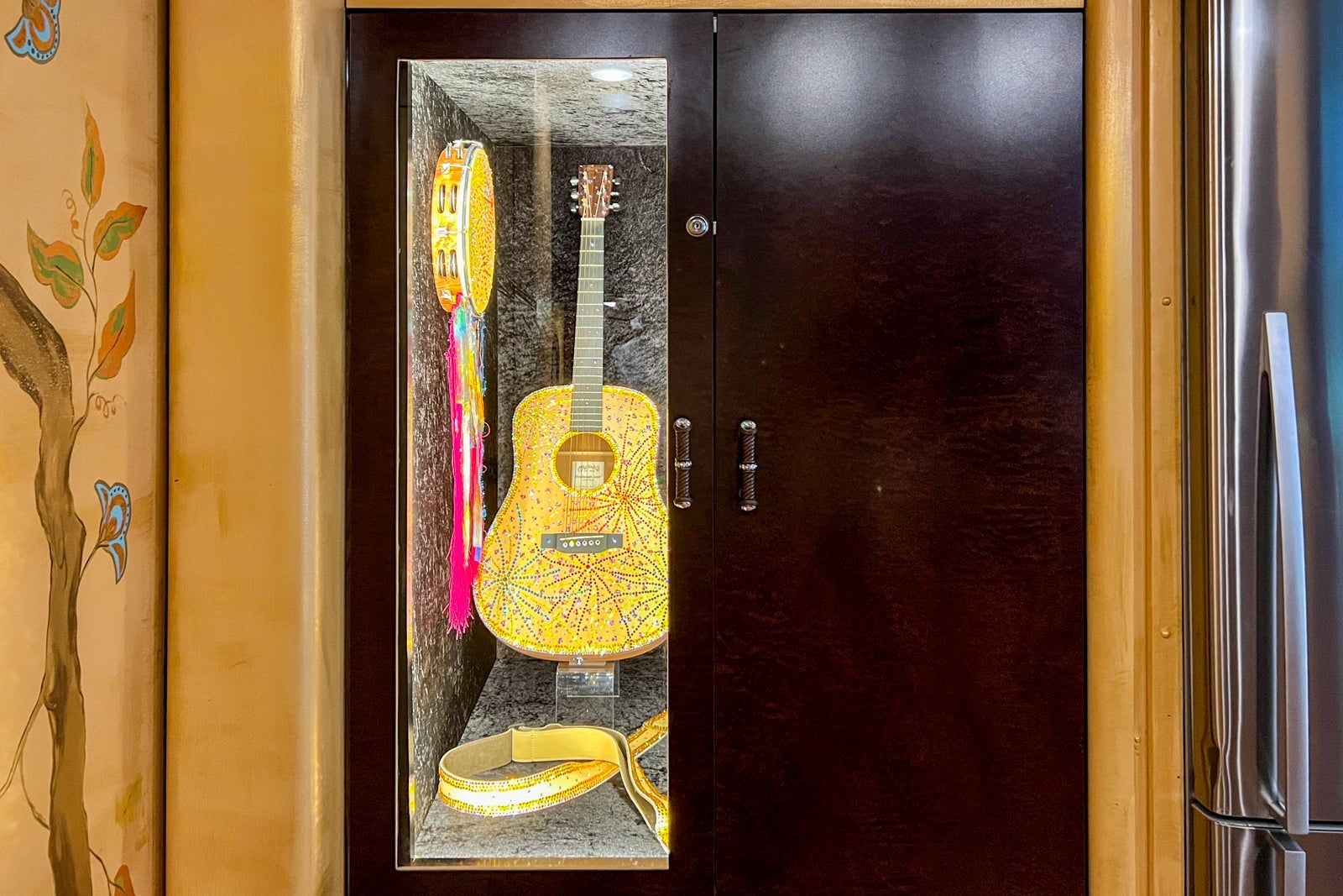 In fact, I was told Dolly loves to make her own meals so much that in the bus's kitchen there's a full-size refrigerator (bigger than the one in my New York City apartment) that required removing the bus windshield to fit it inside. The fridge was stocked with Coca-Cola products, including root beer — her favorite.