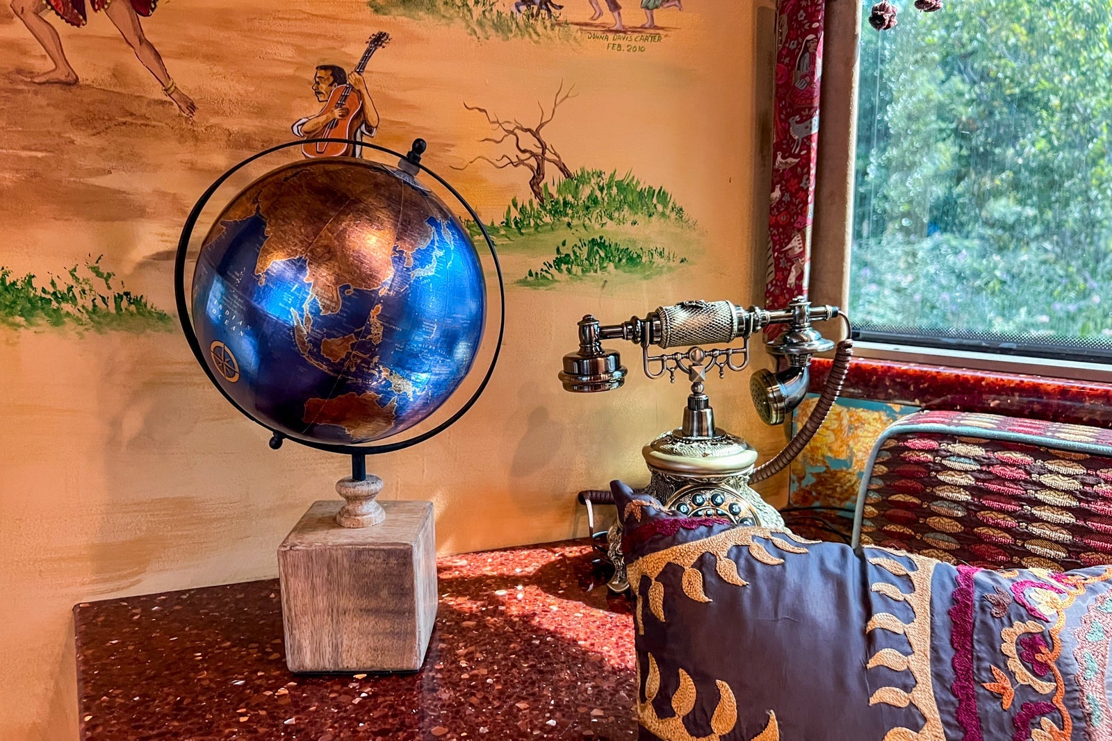 Around the main living and kitchen area, a close friend of Dolly's, Donna Davis Carter, helped customize the space with hand-painted murals. In one scene, Carter depicted herself and Dolly dancing in colorful outfits around a fire.