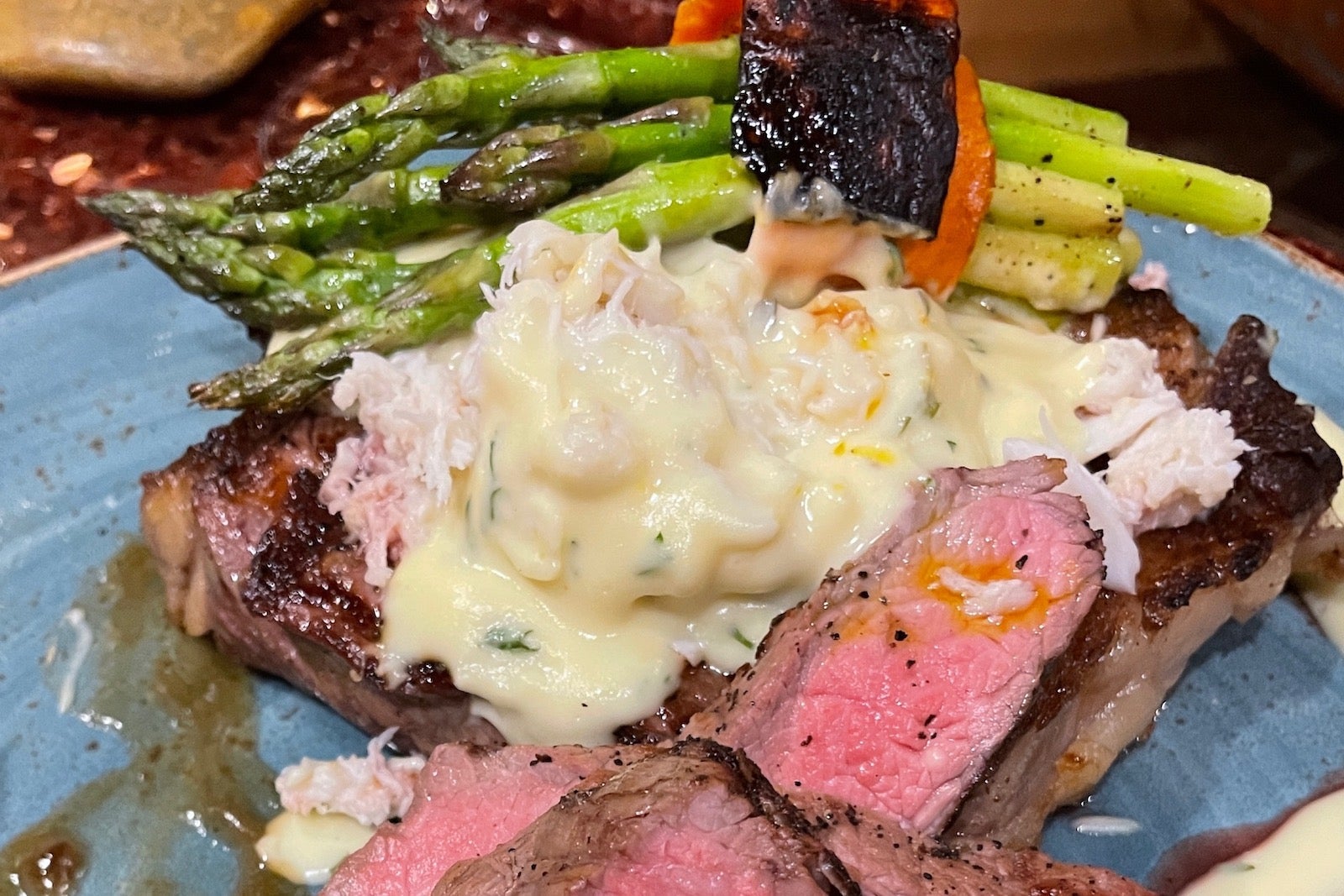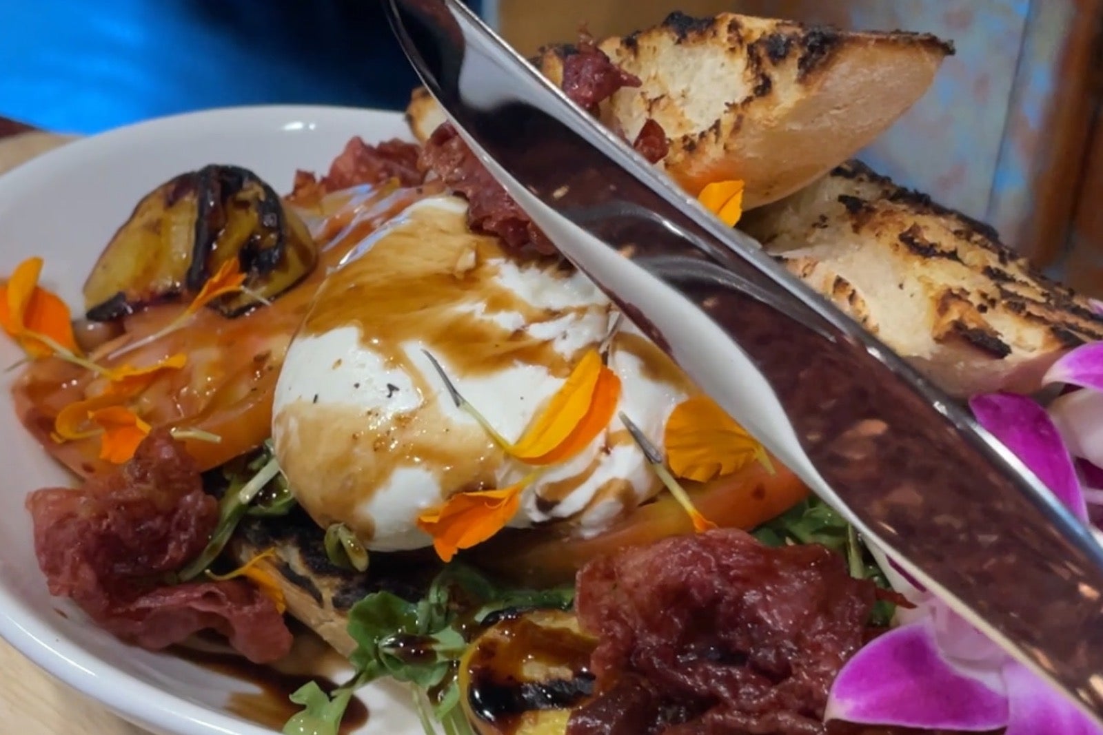 Then there was a burrata salad with crispy bacon, a juicy steak with mashed potatoes and bundled asparagus, and even an entire grilled fish dish. Galvin even works with a special purveyor to source edible flowers to use as garnish — and you can bet your bottom dollar we ate those, too.