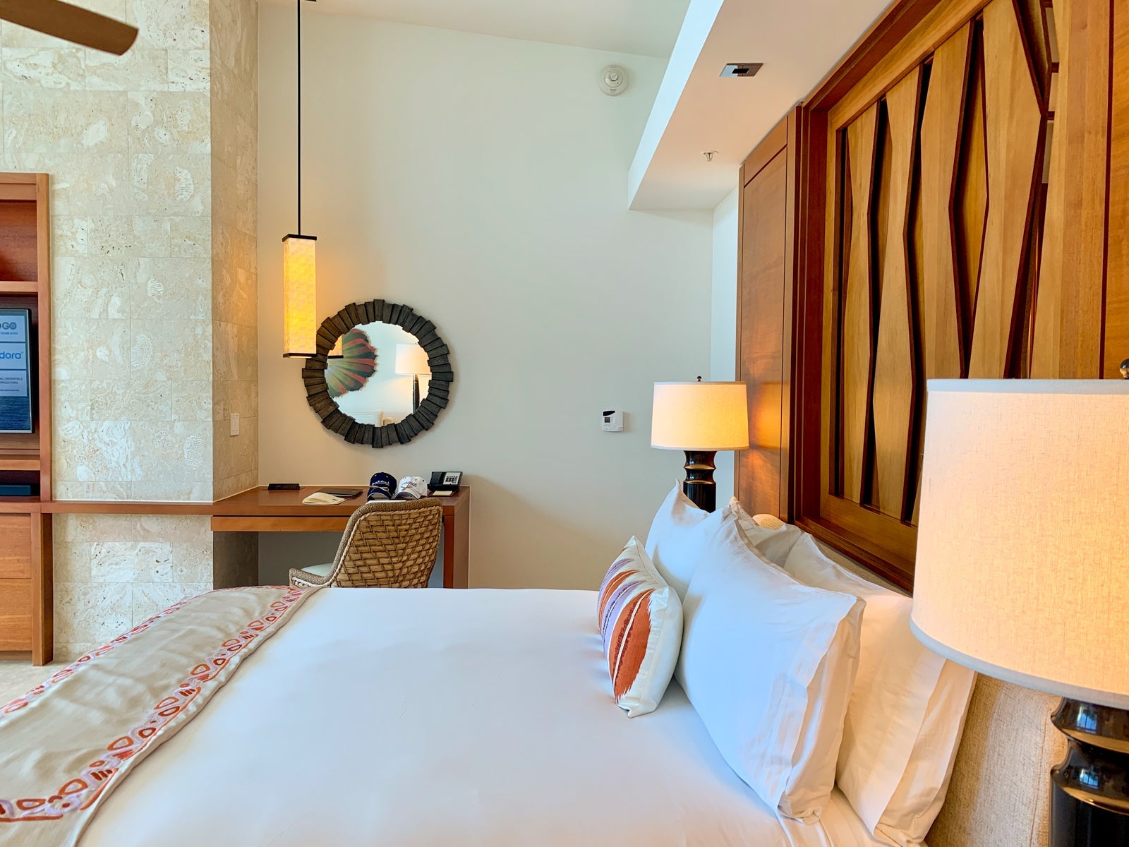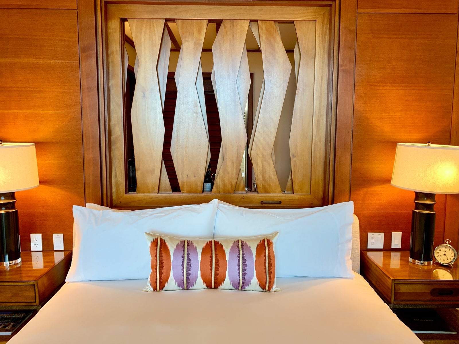 The predominantly white king-sized bed was beautifully offset by a rich wood headboard that had a slatted design feature that you could keep open or close to not allow light in from the bathroom.