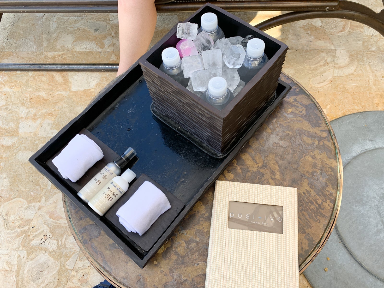 We visited the stretch of beach adjacent to the Positivo pool for a couple of hours one afternoon. The resort offered full service on the beach, so we were tended to within a few minutes of sitting down. The server brought a tray with sunscreen and lotion, several water bottles and wet, cold washcloths. I thought this was a nice touch, and something that went above and beyond a typical beach resort, where sunscreen alone can be a significant cost. Then again, with the room rates at Dorado, sunscreen should be included.