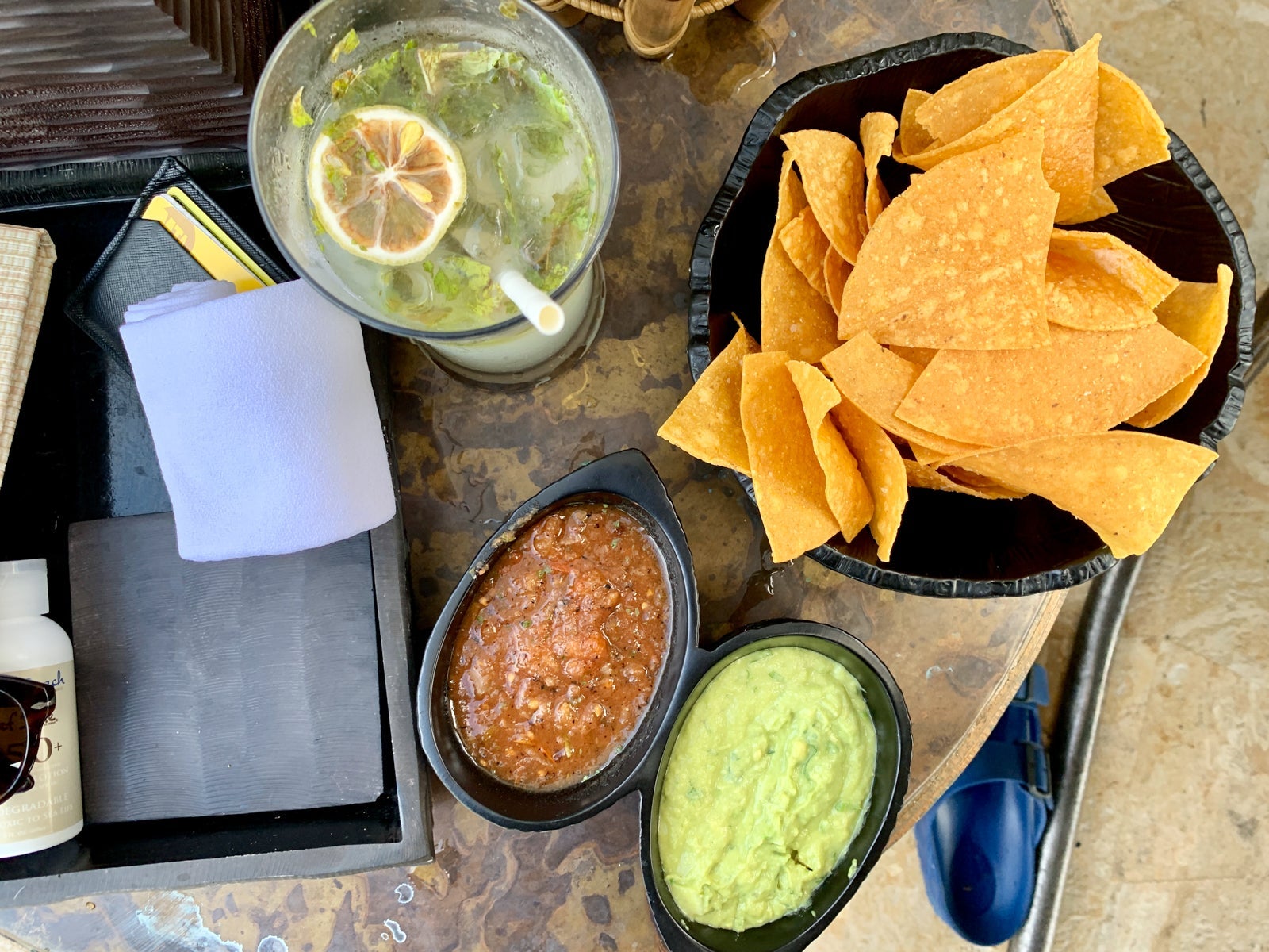 When we found ourselves with a couple of hours of downtime, we spent it sitting by and swimming in the pool, which, of course, works up an appetite. We ordered chips and guacamole, as well as a round of "skinny" mojitos (a typical mojito but with less sugar) to keep us going until dinnertime.