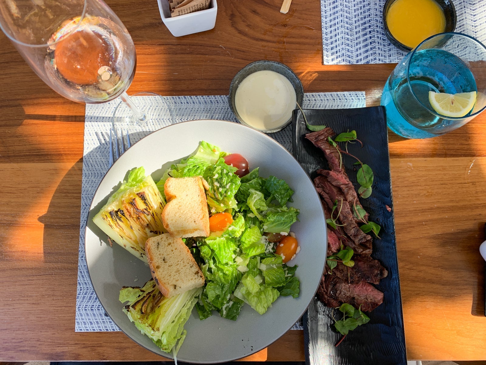 The space itself was gorgeous too -- it gave me 1950s-Caribbean-beach-club vibes. Plus, the music, which I'll call "ambient beach beats" contributed to the relaxed atmosphere. I ordered a Caesar salad with churrasco as well as a glass of rosé -- it was the perfect way to kick off our stay at Dorado Beach.