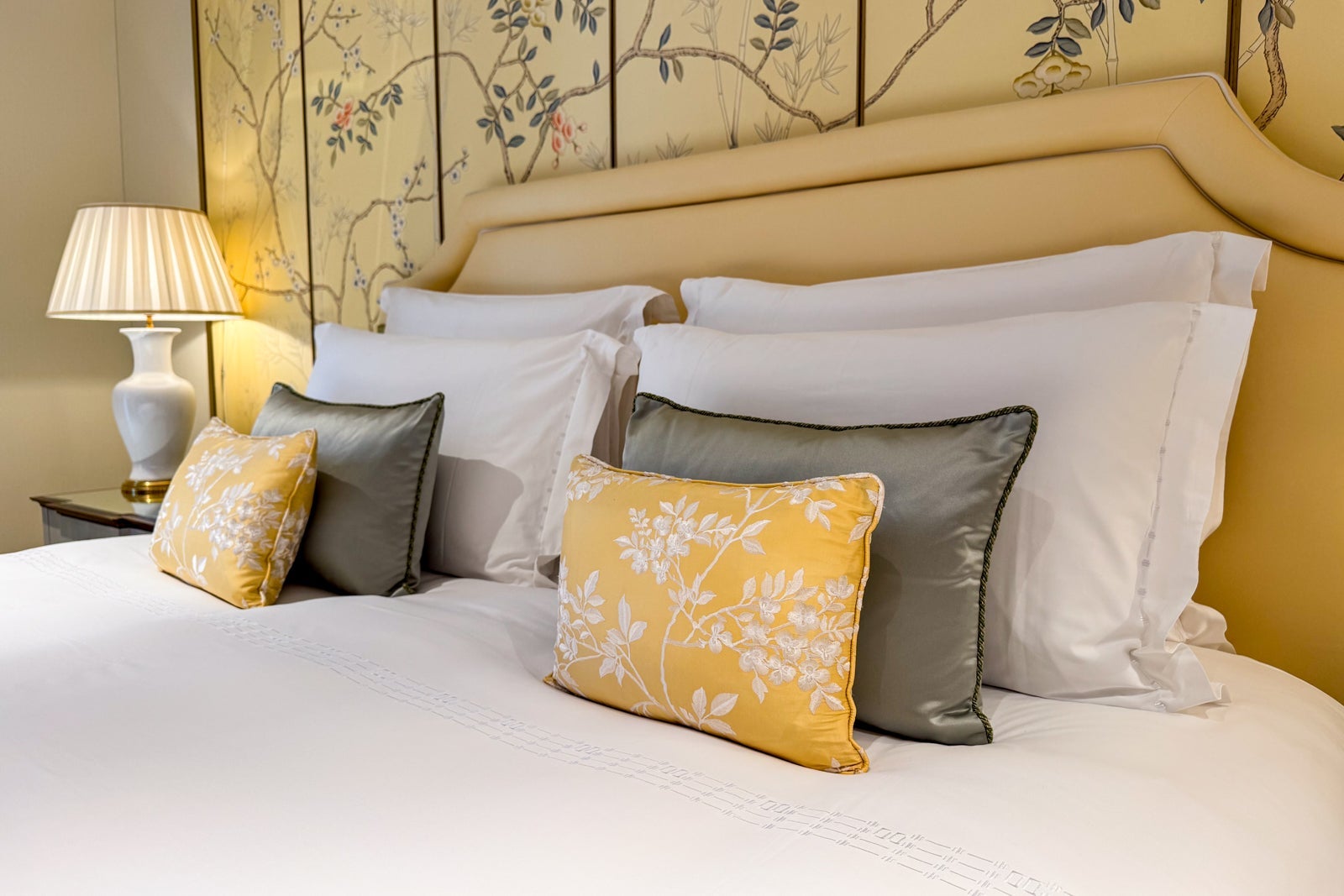 The bedroom's main lemon yellow hue was reflected throughout, including in a scalloped headboard and a de Gournay silk wall hand-painted with flowers and trees that framed the bed, which featured a cushy Vispring mattress that was a pleasure to sink into each evening.