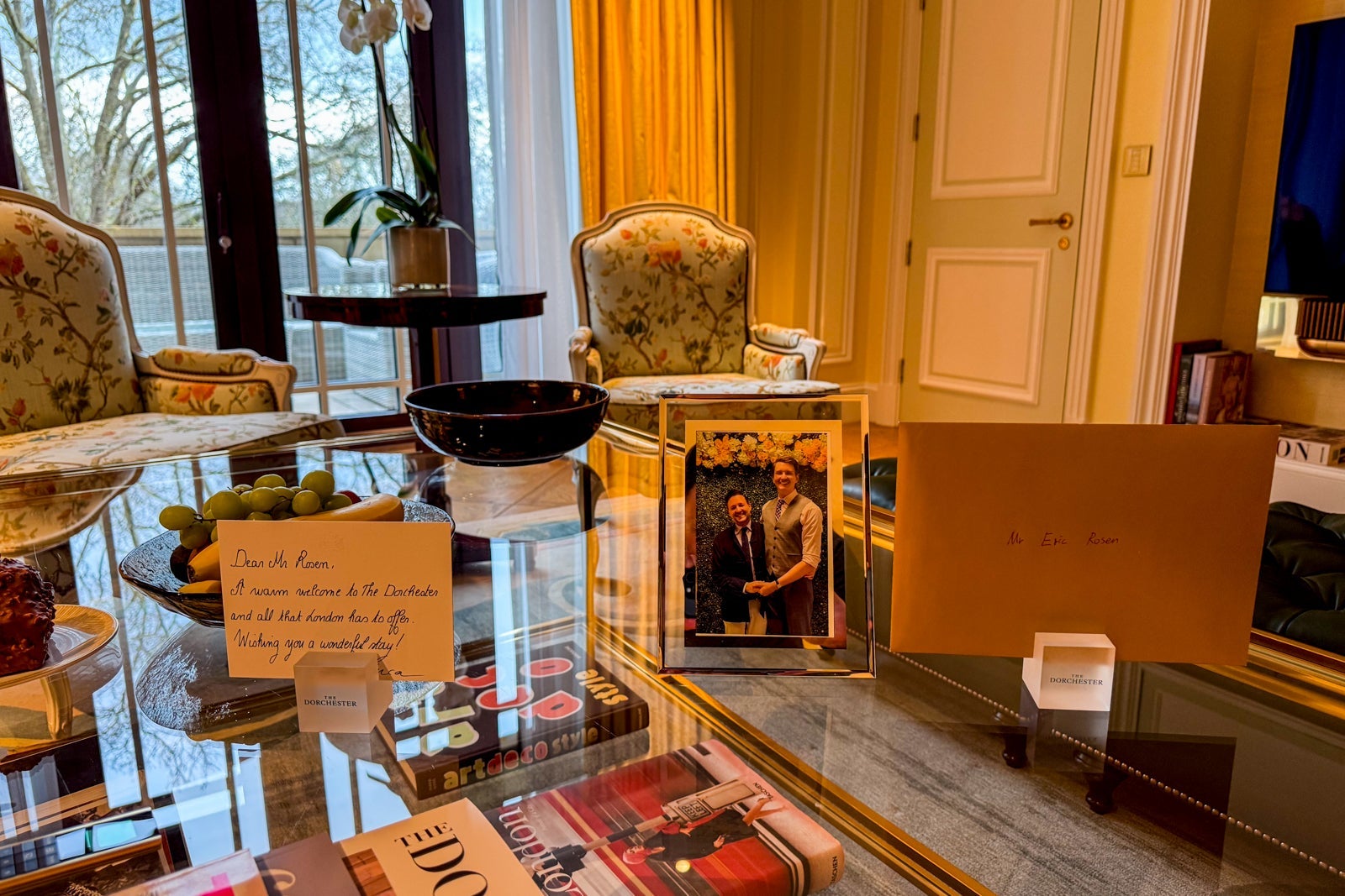 The sitting area included a sofa and armchairs with floral upholstery, chinoiserie lamps and a large glass coffee table, where I found a welcome amenity that included a framed photo of me and my husband, all surrounding the wall-mounted flat-screen TV.