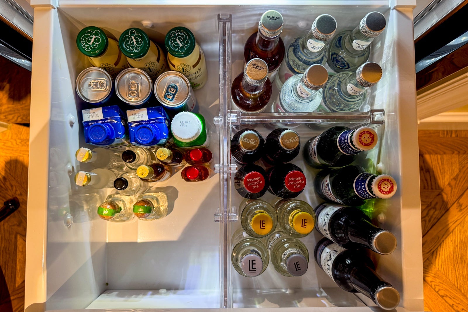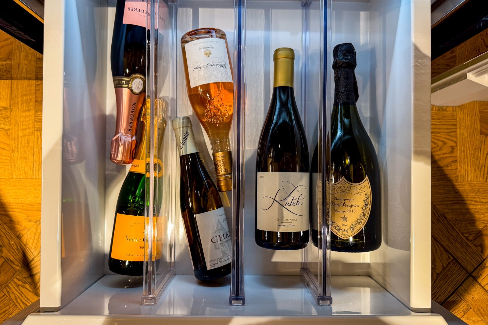 Tucked into the corner was a small work desk and the minibar stocked with fancy treats, including a full bottle of Dom Perignon, as well as an espresso machine.