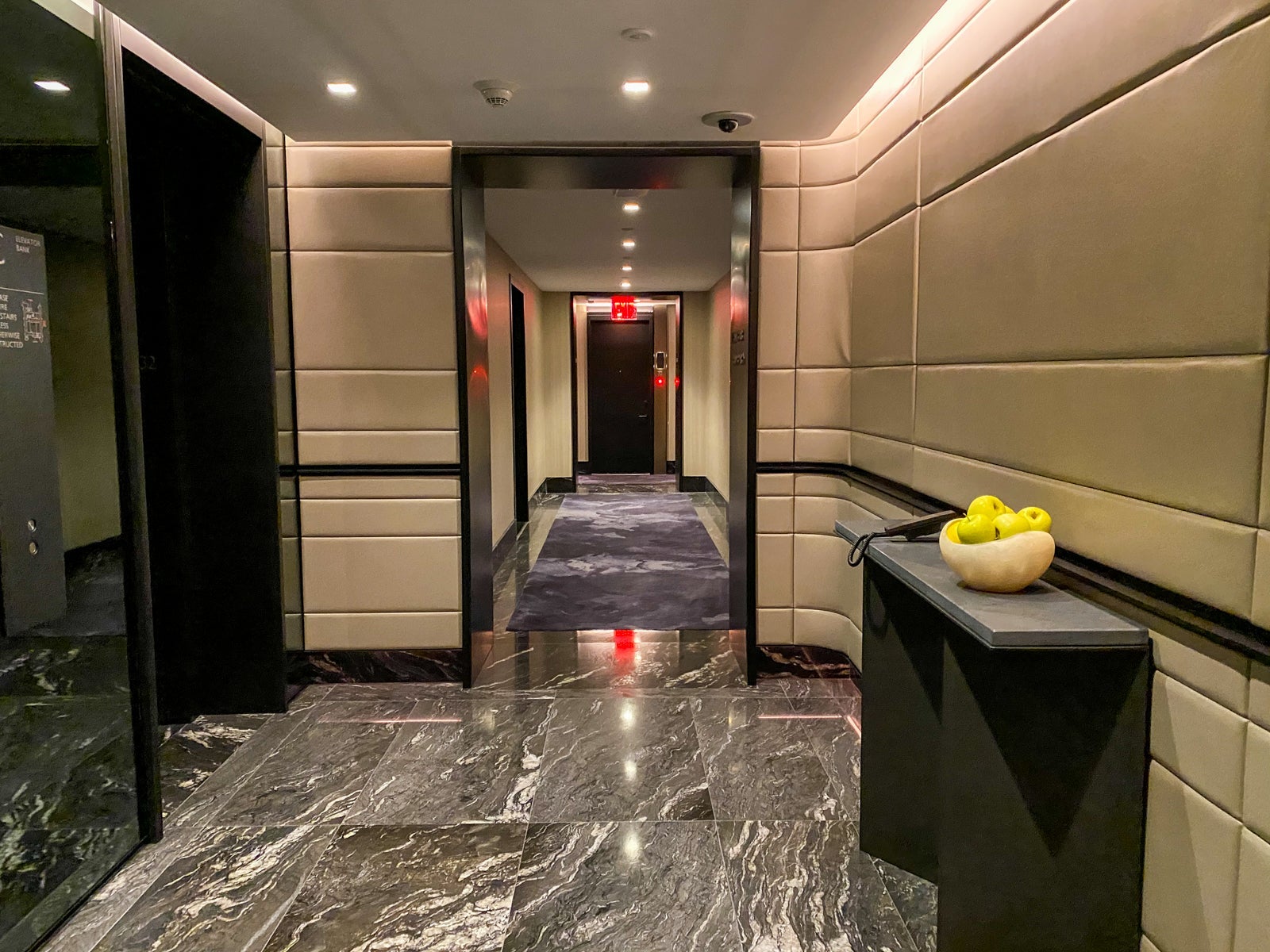 Guests entering the hotel walk through a modest entryway that reminded me of the Times Square Edition. Attendants in white Karl Lagerfeld jackets directed us to walk through the stone-and-wood space, past an undulating metal wall that made you feel as though you were traveling through some kind of portal, and to the elevator to the 25th-floor lobby.