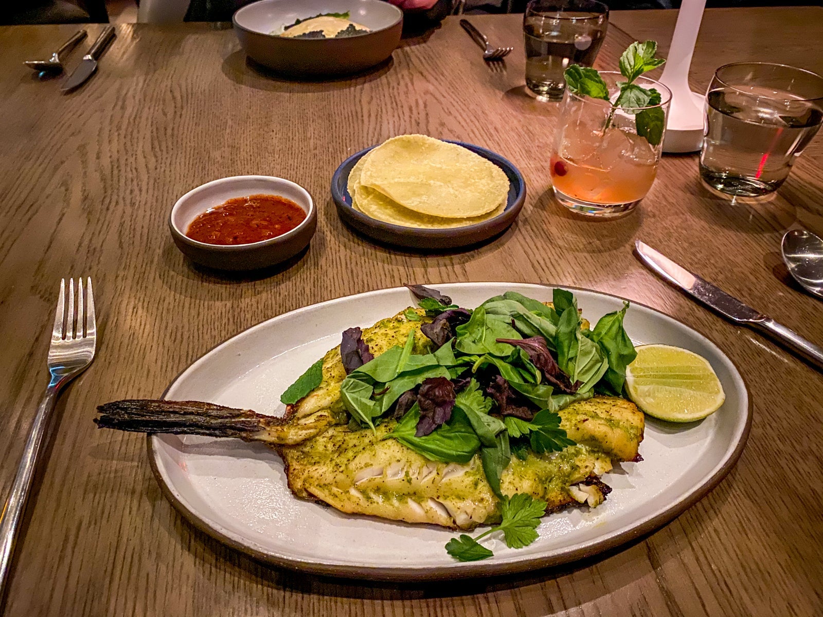 Neither of us had eaten much that day, so we promptly filled in seats between two other parties at the communal table and set about ordering the newly fashioned deviled crab crudo with ginger dressing ($24), and a black bass served with poblano, salsa borracha and a side of warm tortillas ($41) that seems to be a menu mainstay. We also ordered the Atlantic cod ($36) which was cooked well but entirely too salty.
