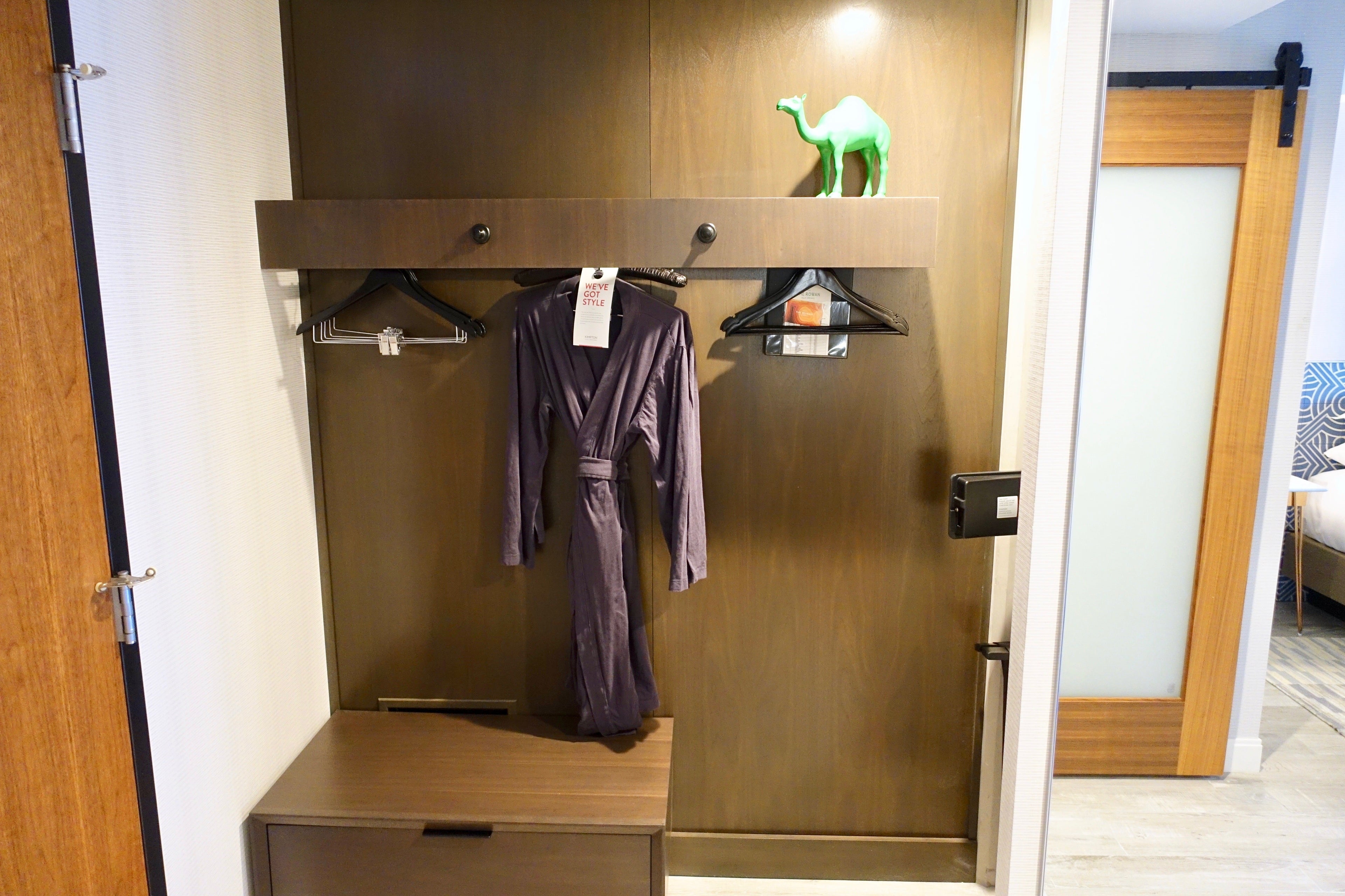 Opposite the bathroom was the closet. Besides the usual bathrobes and safe, it had a yoga mat and a signature "closet smile" item. (Each Kimpton property tries to incorporate a quirky local touch into its closets that will make guests smile when they see it.) In this case, it was a green camel, because the city has an archaic law against riding a camel down Palm Canyon Drive between the hours of 4:00pm and 6:00pm.