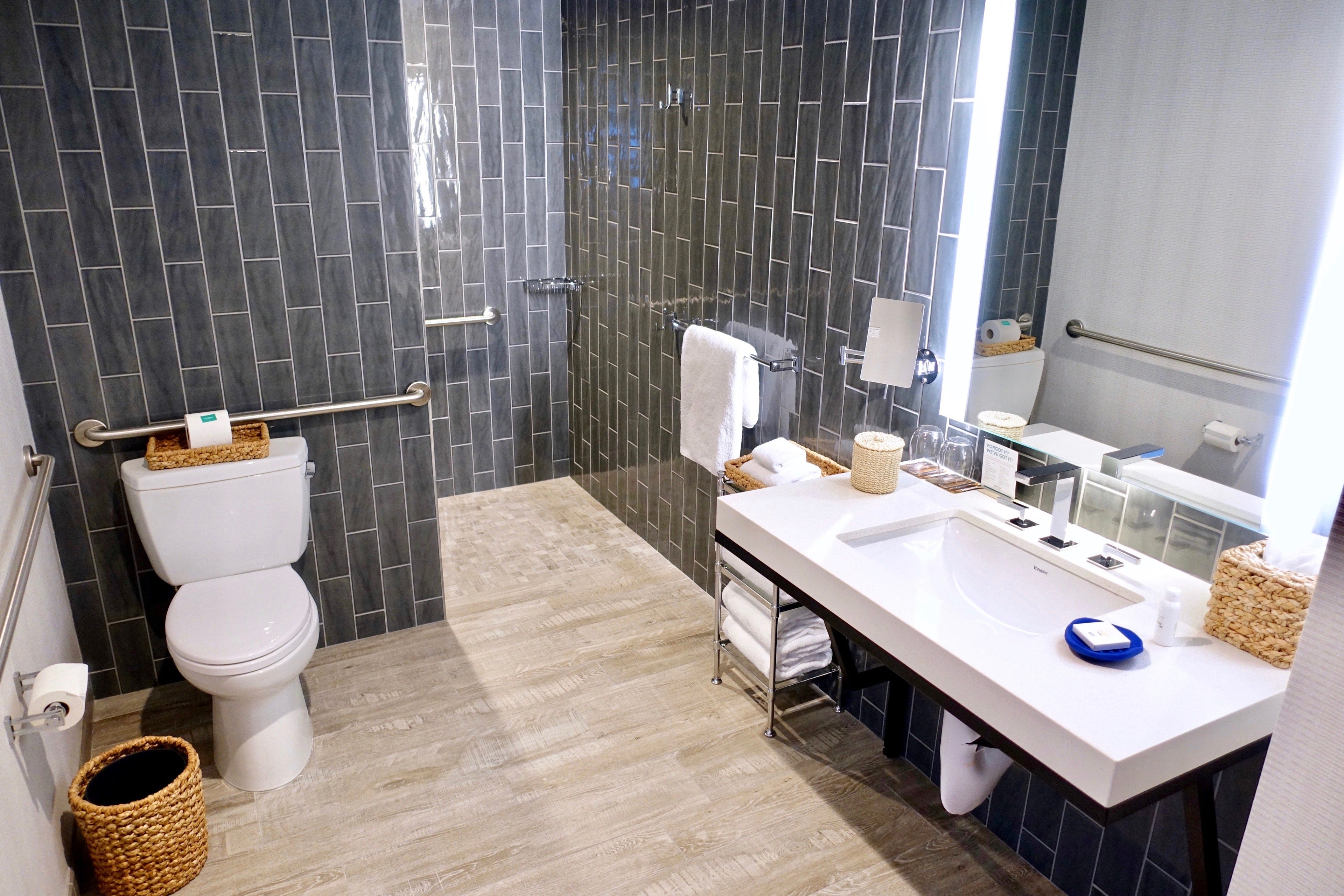 The bathroom was bright and modern. It had just one vanity, but that meant the counter was clear for guests' personal belongings.